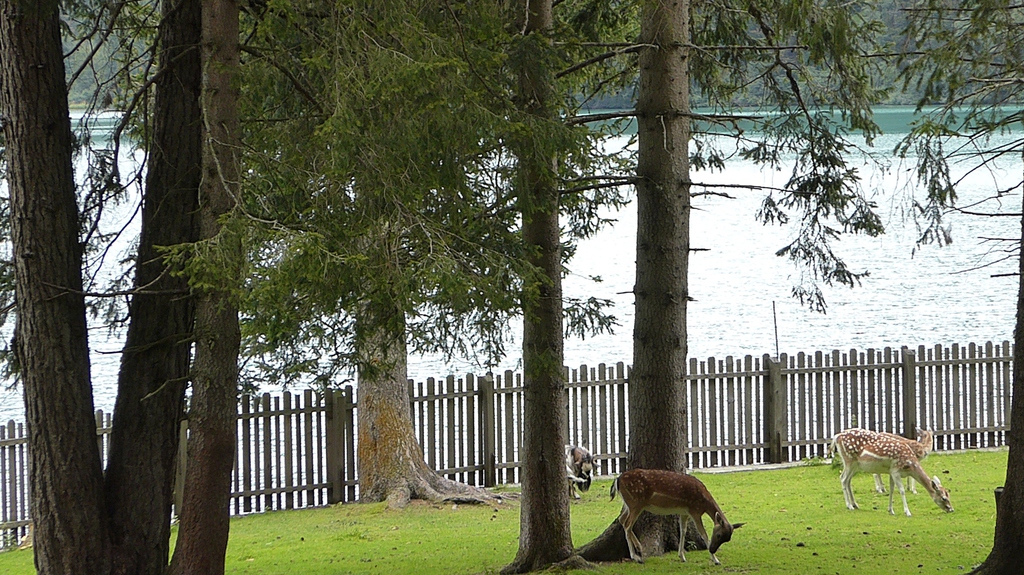 Der Weg führt direkt am Seeufer entlang, spaziert wird auf einem liebevoll angelegten Holzsteg, der es immer wieder ermöglicht, auch direkt zum Wasser zu gelangen. Schwäne tummeln sich am See, in dem sich die gelben Lärchen sowie die Rieserferner - teilweise bereits schneebedeckt - spiegeln. Bald führt der Weg über Stufen in den Wald hinein, der See tiefgrüne See zeigt sich uns von einer anderen Perspektive. Am Ostende des Antholzer Sees befindet sich ein Restaurant mit großer Spielwiese und Spielplatz, ein idealer Ort zum Verweilen. Gegenüber gibt es Rehe zu bestaunen.