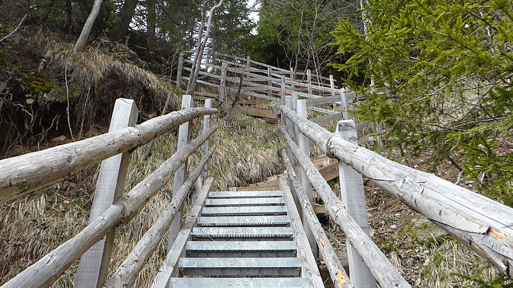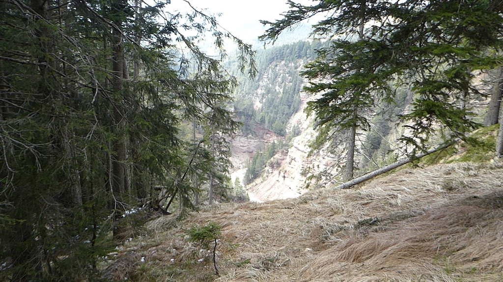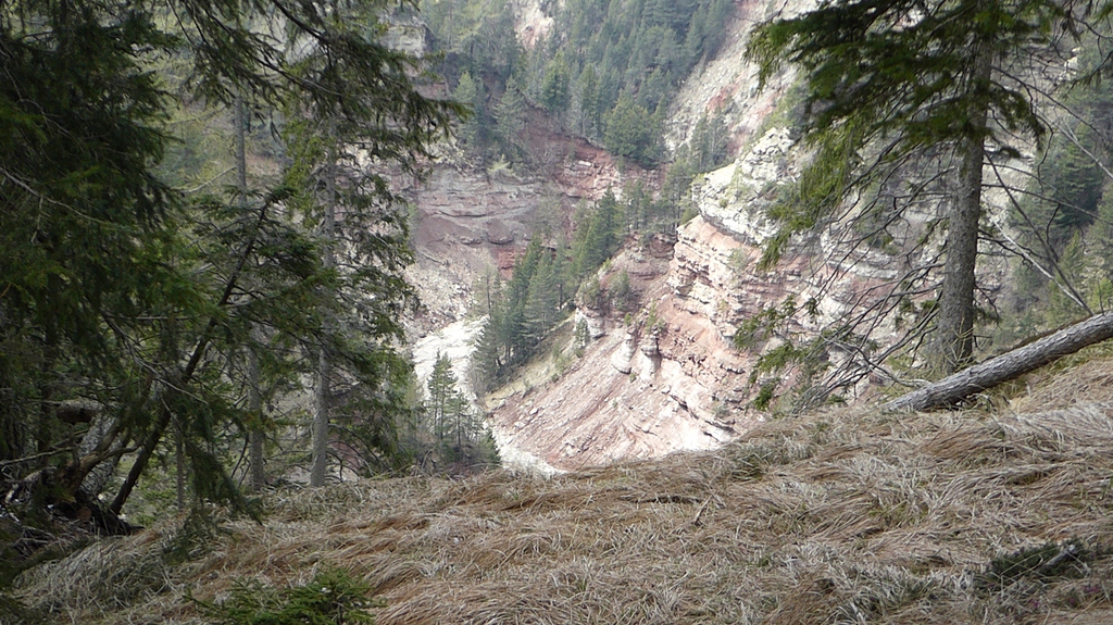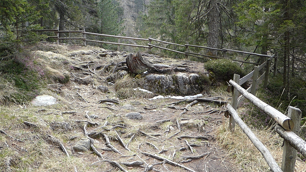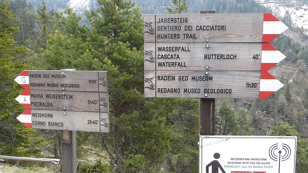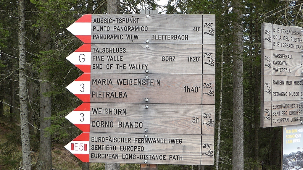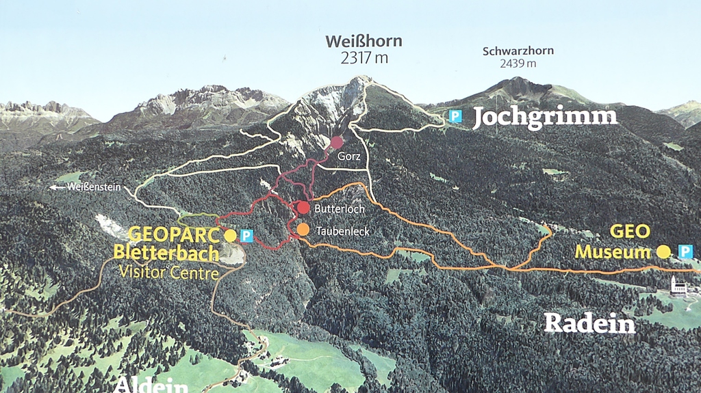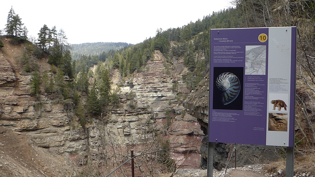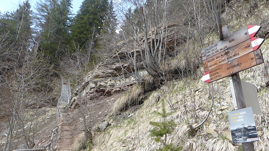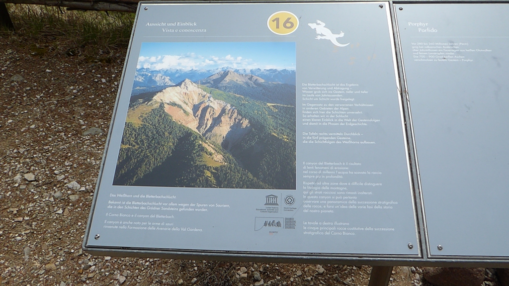 Anschließend drehen wir wieder um und laufen zur letzten Gabelung zurück. Der Jagersteig führt uns nun rechter Hand steil bergauf. Oben angekommen, geht es nach links auf einem breiten Forstweg wieder gemütlich zurück in Richtung Besucherzentrum. Eine besondere Sehenswürdigkeit ist der Geoparc Bletterbach unter dem Weißhorn.
