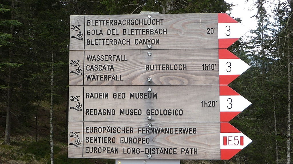 Wir starten am Besucherzentrum GEOPARC in Aldein. Hier können wir uns nicht nur über die Entstehungsgeschichte der Bletterbachschlucht informieren, sondern erhalten auch nützliche Tipps für unsere Wanderung. Außerdem kauft man hier das Eintrittsticket für die Schlucht und kann sich, falls man keinen eigenen Helm dabei hat, gegen eine geringe Gebühr einen solchen ausleihen. Unser Geo-Weg mit der Nr. 3 ist gut beschildert. Außerdem geht es an etlichen Infotafeln vorbei, die uns die verschiedenen Gesteinsschichten näherbringen, ihre Entstehung erklären und über besondere Funde in der Schlucht berichten.