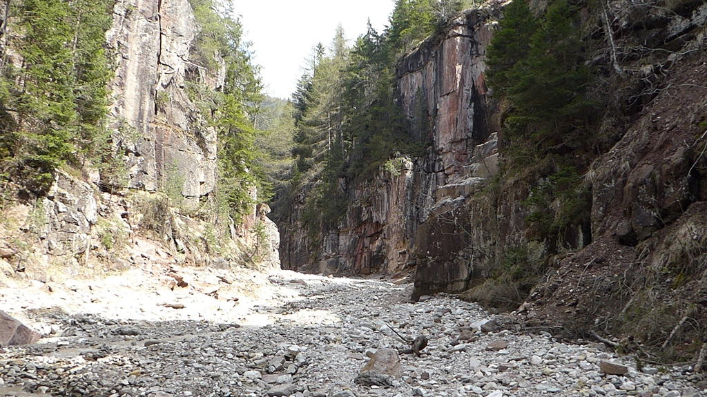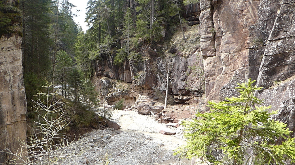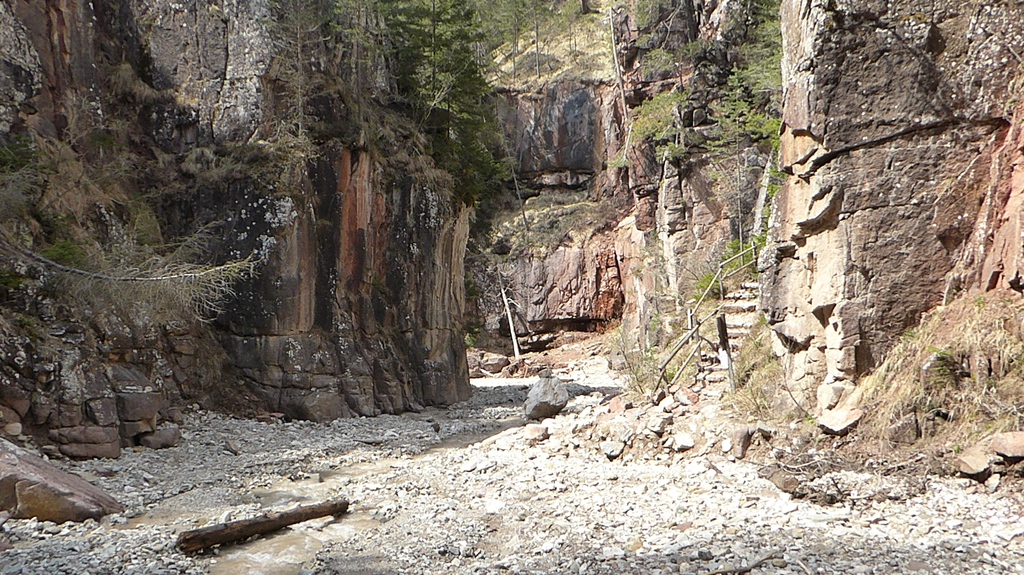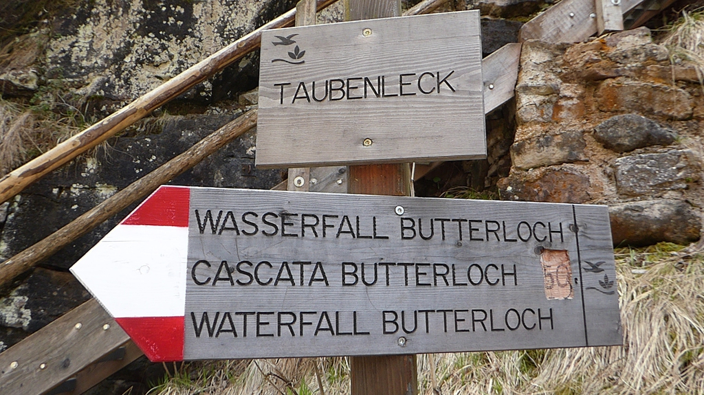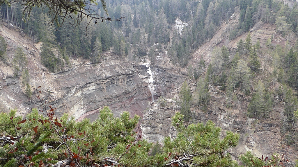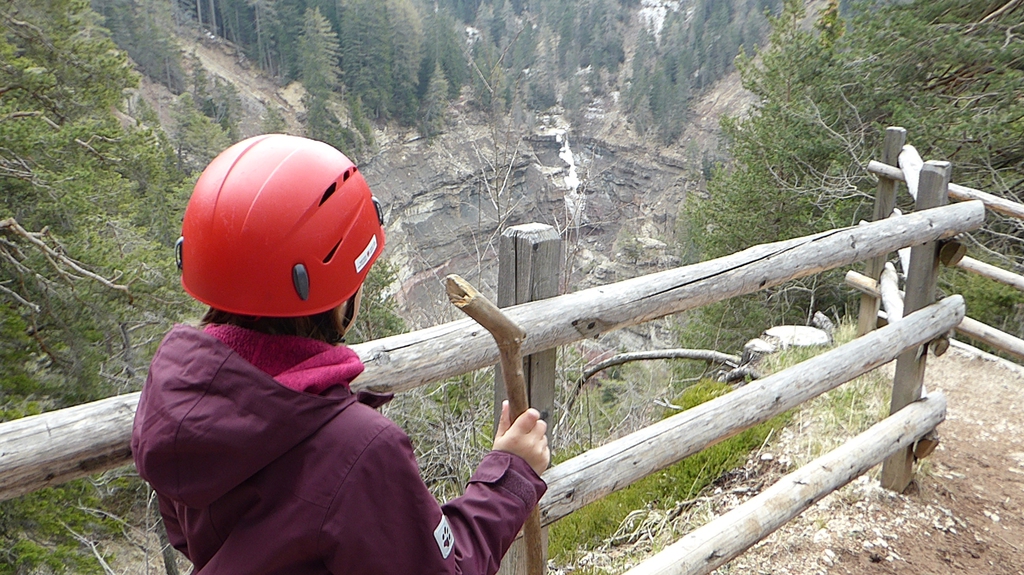 Zunächst steigen wir durch den Wald bergab zum sogenannten Taubenleck (1). Hier befindet sich der Einstiegspunkt zur Schlucht, die insgesamt etwa 8 km lang und 400 m tief ist. Sie wird übrigens auch als der „Grand Canyon Südtirols“ bezeichnet. Wir wandern nun in der engen Schlucht am Bachbett des Bletterbachs aufwärts. In wie vielen verschiedenen Farben die Gesteinsschichten hier wohl leuchten? Schließlich erreichen wir das „Butterloch“ (2) – und staunen über den großen Wasserfall, der dort über die Felsen herabstürzt.