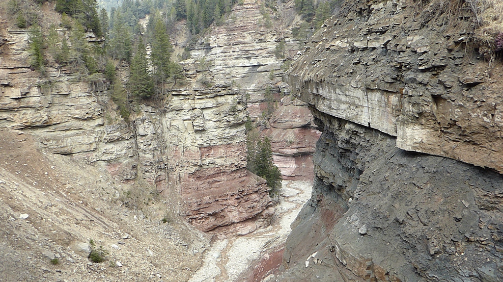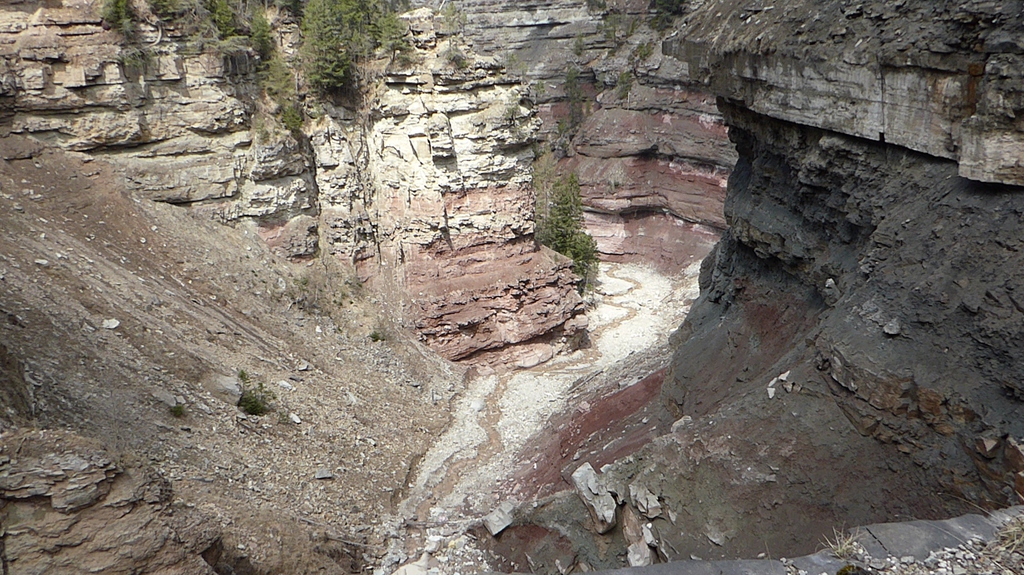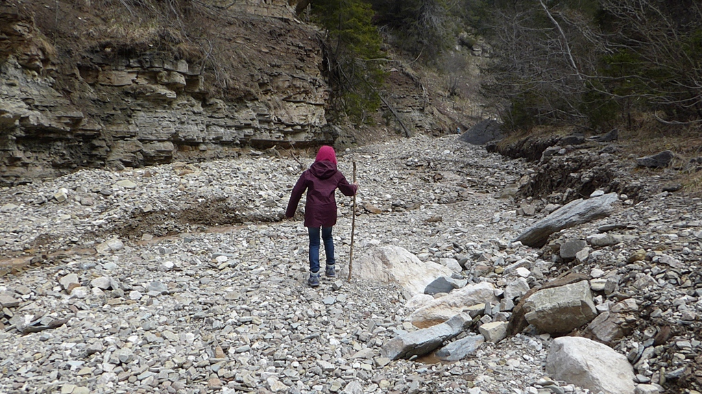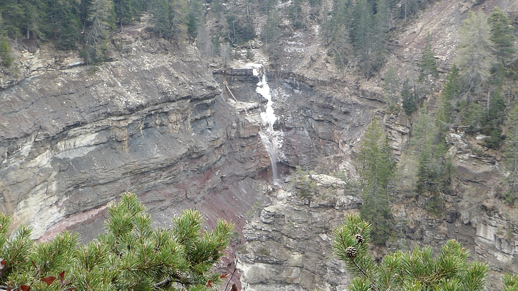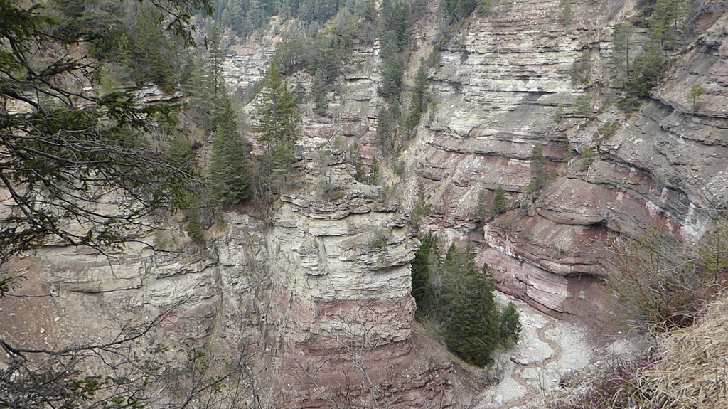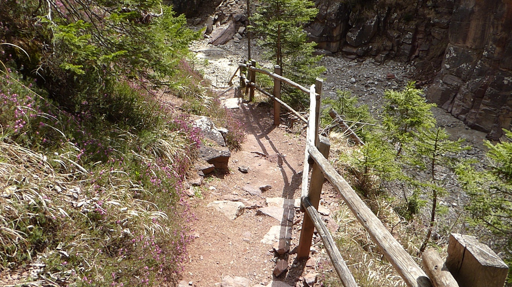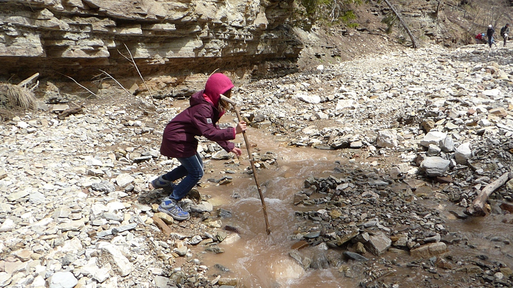 Zunächst steigen wir durch den Wald bergab zum sogenannten Taubenleck (1). Hier befindet sich der Einstiegspunkt zur Schlucht, die insgesamt etwa 8 km lang und 400 m tief ist. Sie wird übrigens auch als der „Grand Canyon Südtirols“ bezeichnet. Wir wandern nun in der engen Schlucht am Bachbett des Bletterbachs aufwärts. In wie vielen verschiedenen Farben die Gesteinsschichten hier wohl leuchten? Schließlich erreichen wir das „Butterloch“ (2) – und staunen über den großen Wasserfall, der dort über die Felsen herabstürzt.