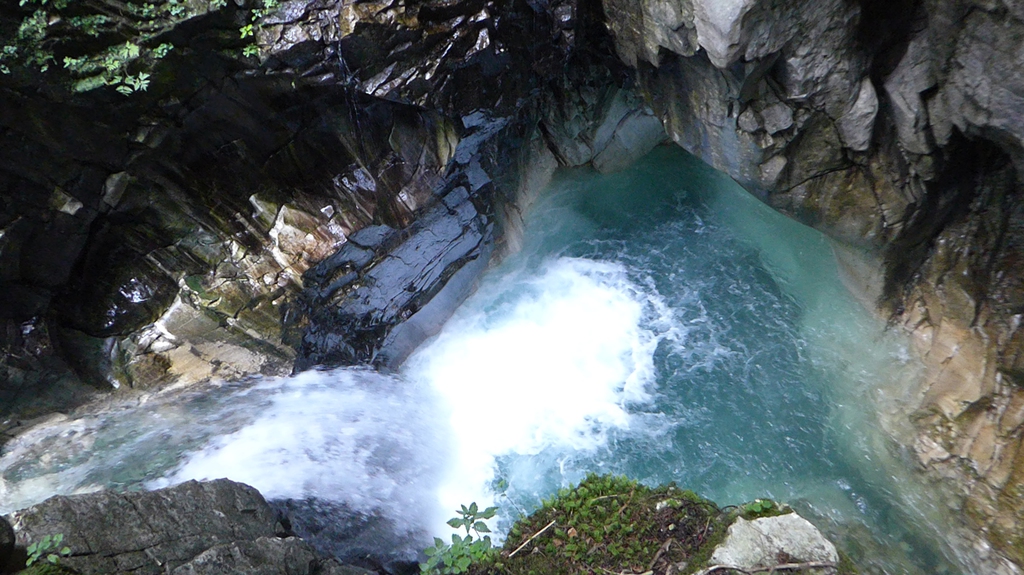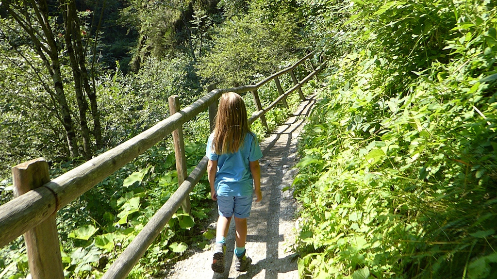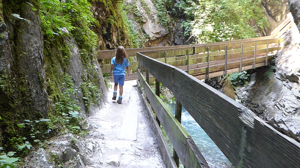 Die schon seit 100 Jahren zugängliche Klamm bietet in ihrem Kernstück eindrucksvolle Tiefblicke in glatte Kolke, durch die der Sturzbach tost. Eine Gedenktafel erinnert an den Besuch von Kaiser Franz-Joseph. Wir bleiben immer wieder stehen und genießen die sich ändernden Perspektiven inmitten der Naturgewalt. Auf einem Felsen befindet sich eine Aussichtskanzel mit Bänken. Geniales Abenteuer für gross und klein sowie jung und alt.