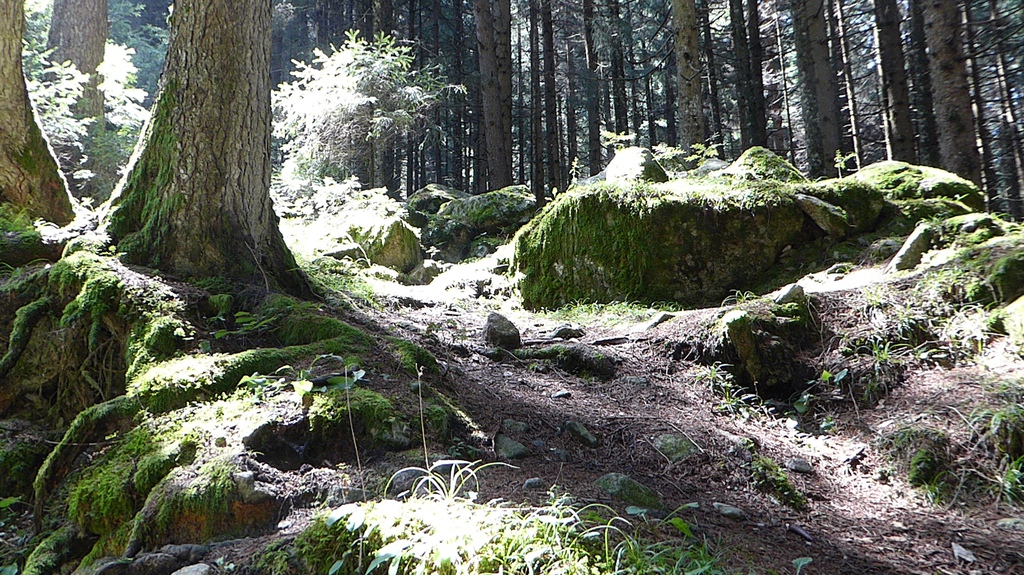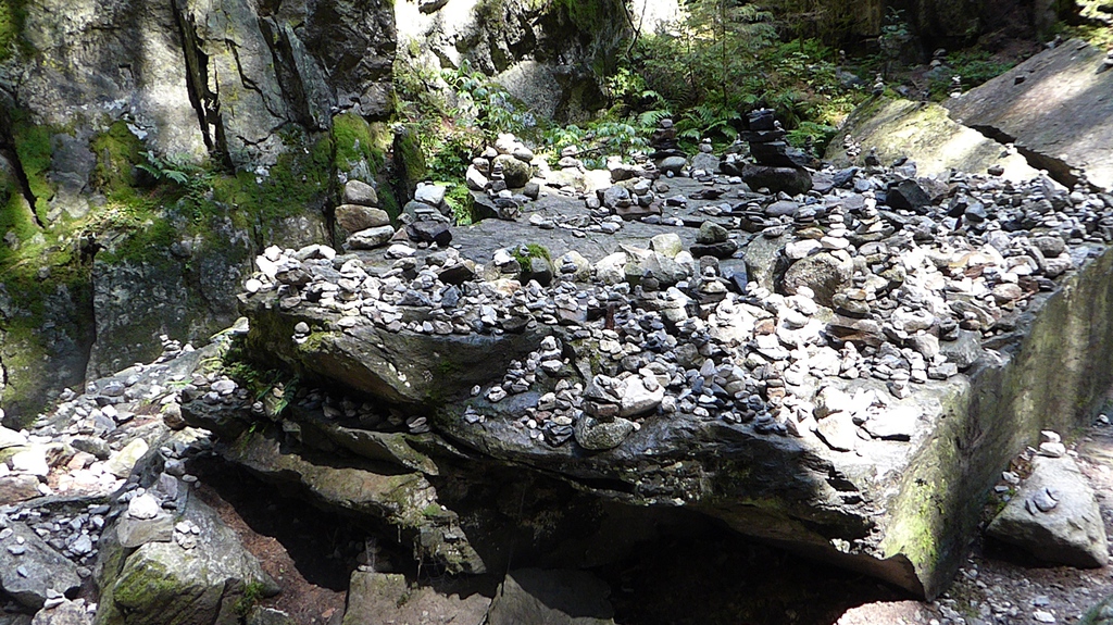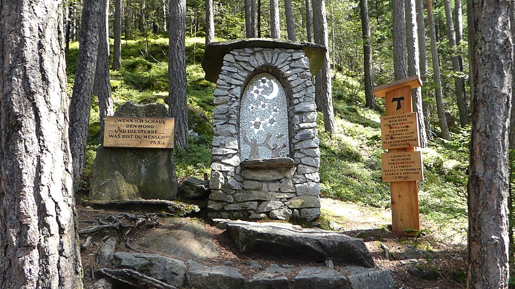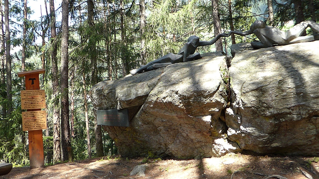 Untergrund nach oben wandern. Eine kleine Höhle und ein Besinnungsplatz mit Holzfiguren werden nun Ihre Aufmerksamkeit erregen.