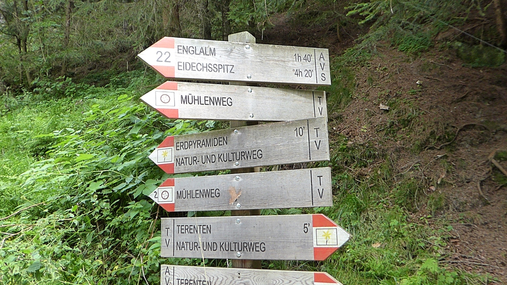 Wir starten im Dorfzentrum und folgen dem Mühlenweg mit eigenen Infotafeln. Wir halten uns rechts und erreichen nach ca. 20 - 30 Minuten bergauf die Erdpyramiden. Tipp: Bei einer Brücke gibt es auch die Möglichkeit den Mühlenweg nach links zu beginnen, allerdings befinden sich die Mühlen direkt oberhalb der Erdpyramiden, so dass die Highlights nicht erst zum Schluss geballt kommen müssen, sondern direkt zu Beginn (deshalb rechts halten).