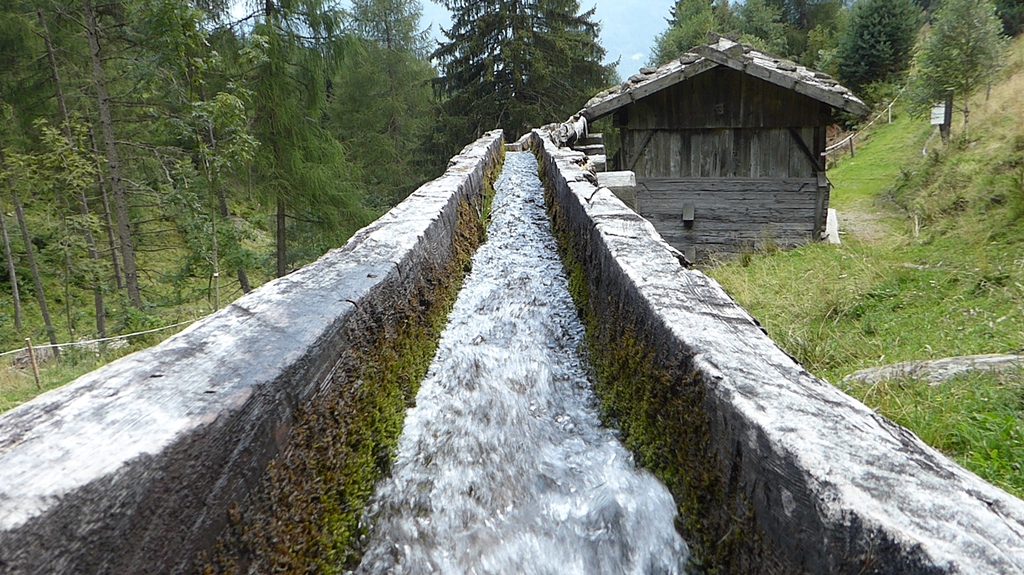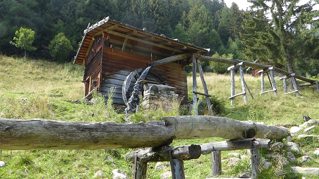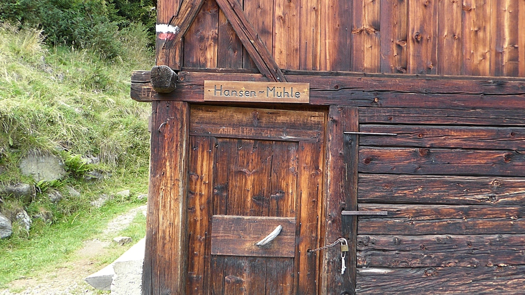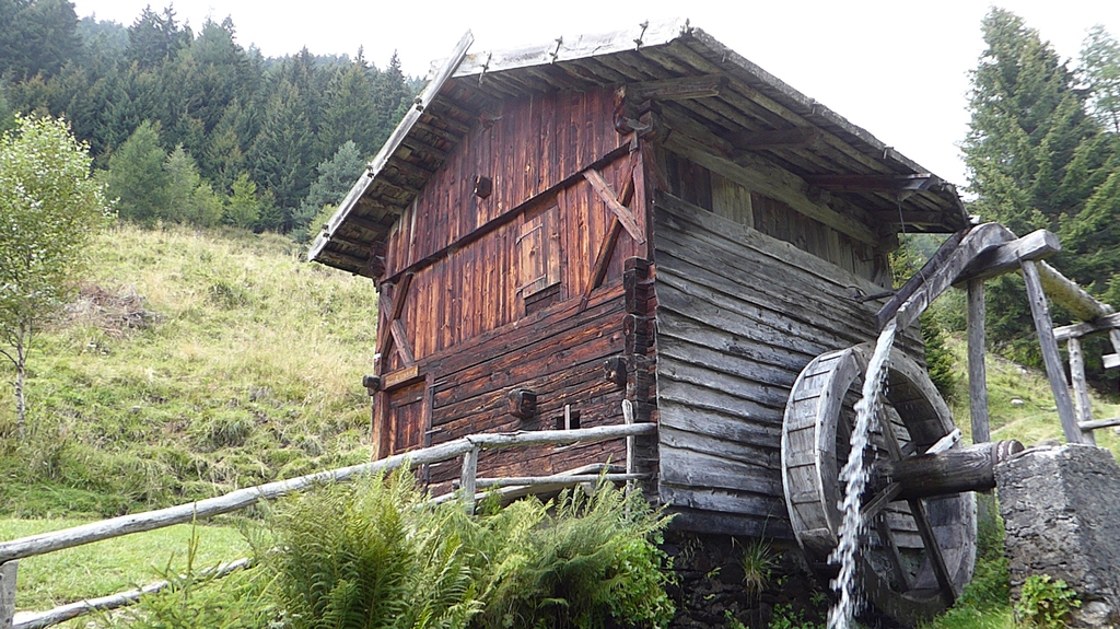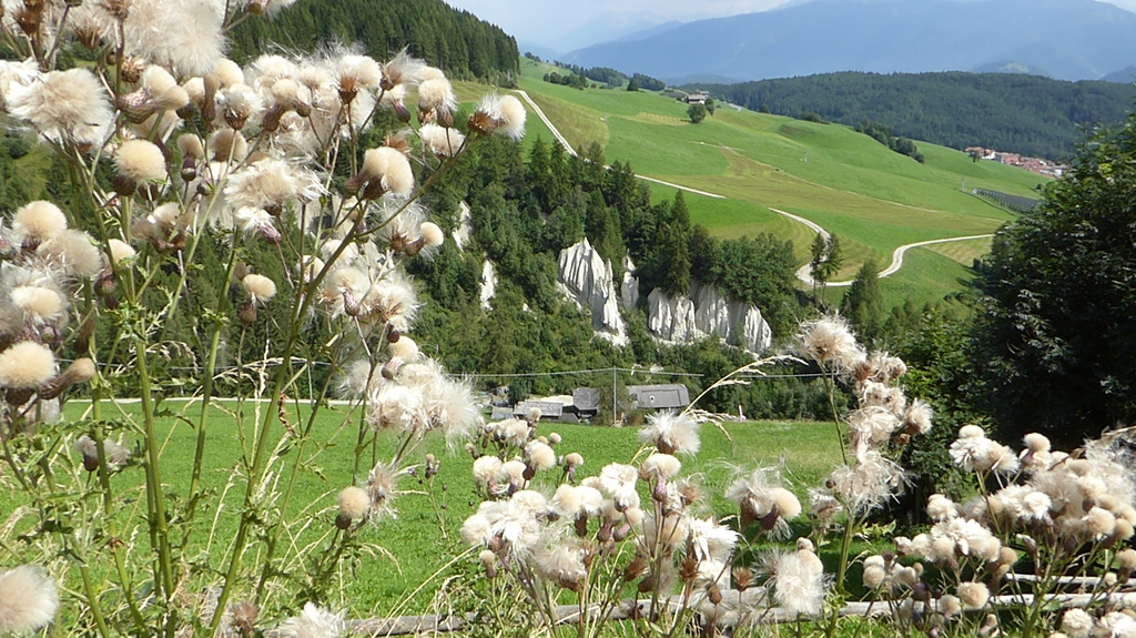 Unterhalb der letzten Mühle führt uns ein Weg über den Bach, weiter zum alten Flitschhof. Er ist unbewohnt, ursprünglich war es ein typischer Einhof, später wurde das Futterhaus dazugebaut. Aufmerksame beobachter können am Dachgiebel ein seltsames Gesicht entdecken. Welche Bedeutung hatte es wohl einmal? Vorbei am alten Flitschhof geht es nun bergab Richtung Dorf. Hier bietet sich ein wunderbarer Blick auf die Dolomiten im Südosten und hinunter ins Dorf.