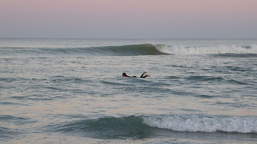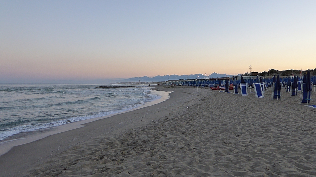 Die Strecke beträgt ca. 4 km für die 2 Stunden einzuplanen sind. Man kann es auch beliebig verkürzen oder verlängern. In der Einsamkeit der frühen Morgenstunden begleitet uns das Rauschen des Meeres, während bereits vereinzelte Angler vom Strand aus fischen. Da die Brandung im Morgenrot stärker ist, sehen wir erstaunlich viele Surfer, die ebenfalls früh aufgestanden sind und auf den Wellen reiten. Im Norden geniessen wir den Blick auf die Apuanischen Alpen, die sich hoch erheben und rot eingefärbt sind.