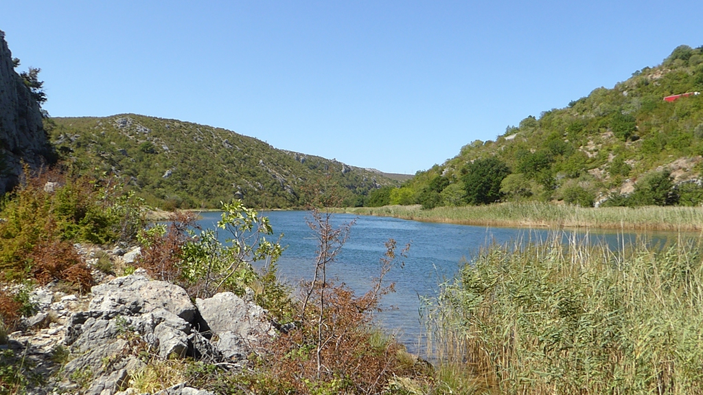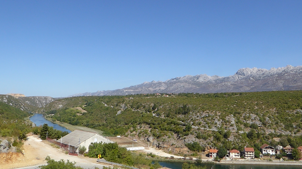 Wir verlassen das Plateau und fahren nach Obrovac. Wir parken auf einem großen Platz am Ufer des Zrmanja und wandern auf der rechten Seite die Schlucht entlang des Flusses (44.198485, 15.685443, bzw. 44°11'54.6"N 15°41'07.6"E). Der Fluss macht einige Biegungen, bis wir zu einer Getreidemühle gelangen. Wenn man von hier aus weitergeht, gelangt man bis zu einer Staumauer inkl. Elektrizitätswerk. Wir kehren bei der Getreidemühle wieder um und gehen auf dem Hinweg wieder zurück nach Obrovac.
