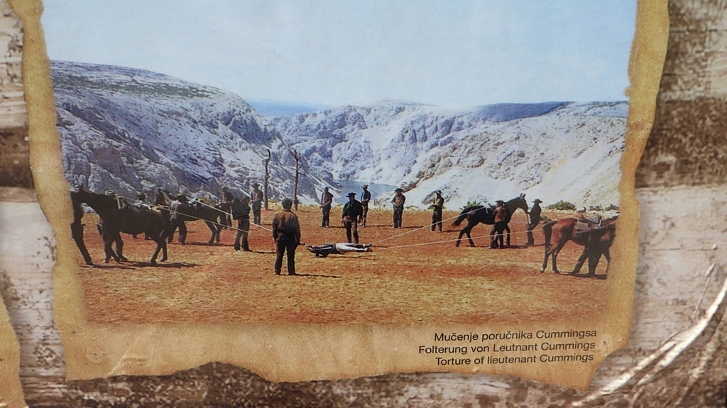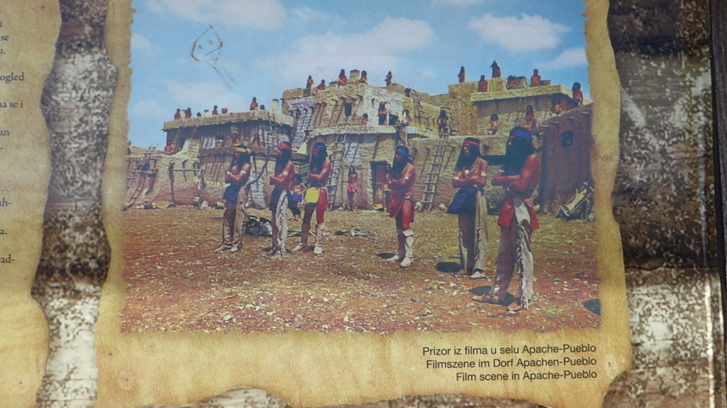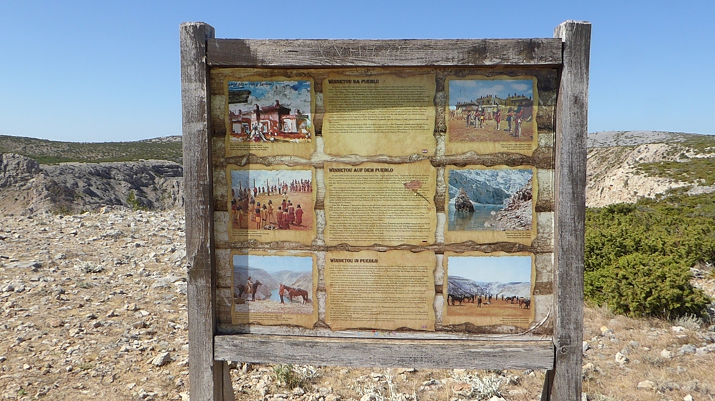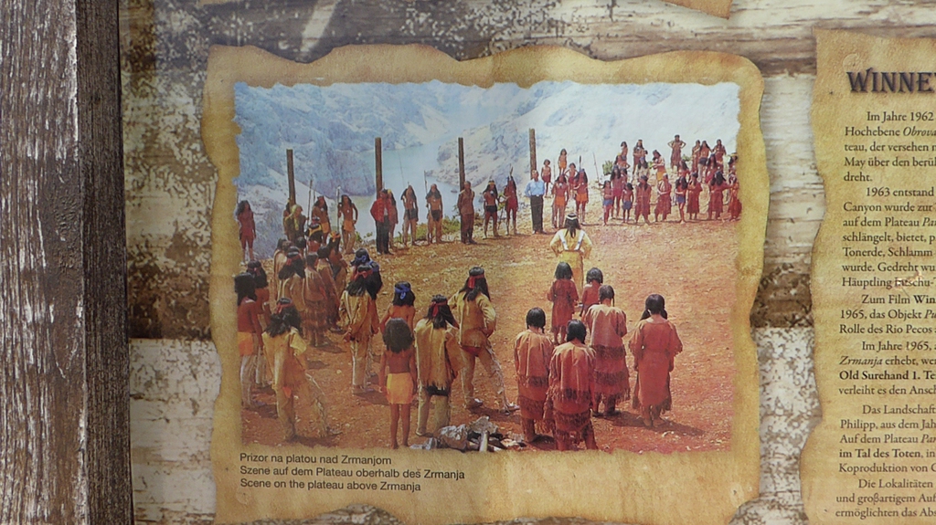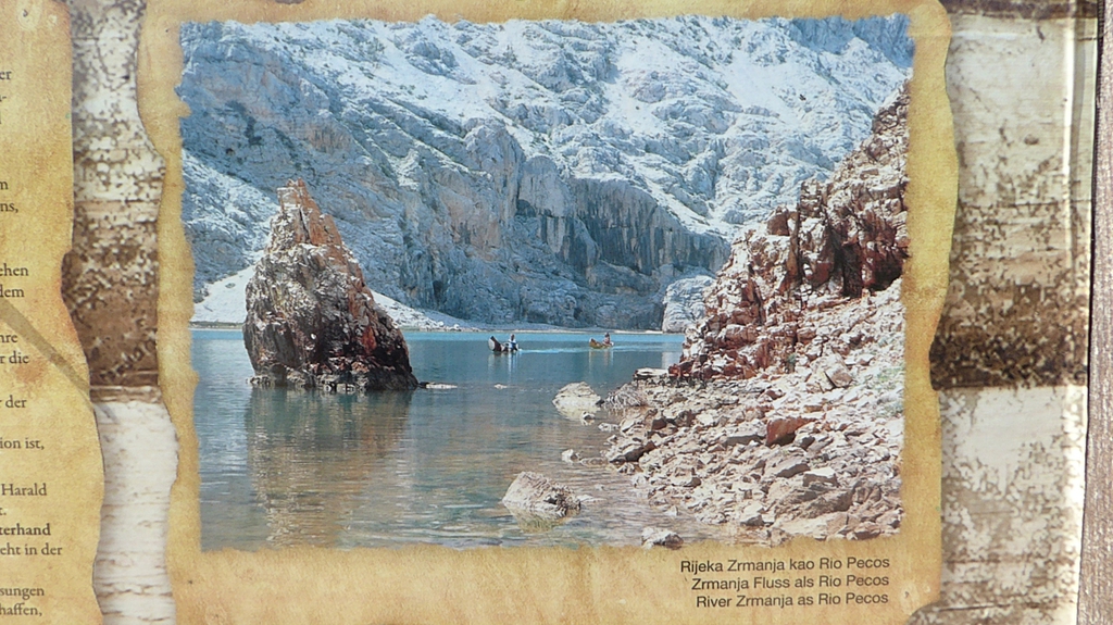 Eine Holztafel am Zrmanja Canyon führt die berühmtesten Szenen auf, die in dieser imposanten Kulisse gedreht wurden. Dazu zählen die erste Begegnung von Winnetou und Old Surehand, das Apachen-Dorf Pueblo oder die Folterung von Leutnant Cummings durch die Banditen im Film "Im Tal der Toten".