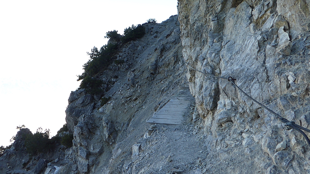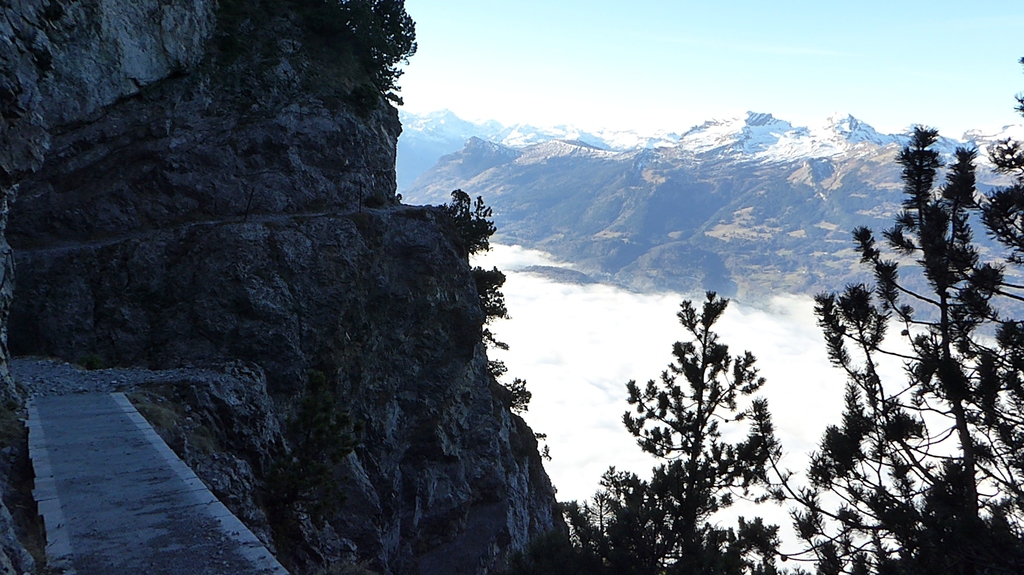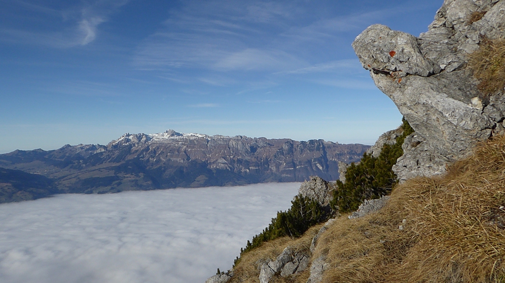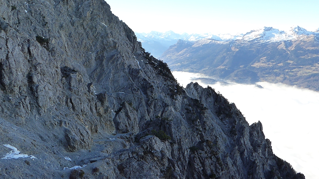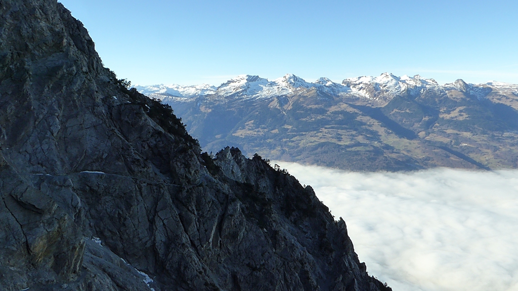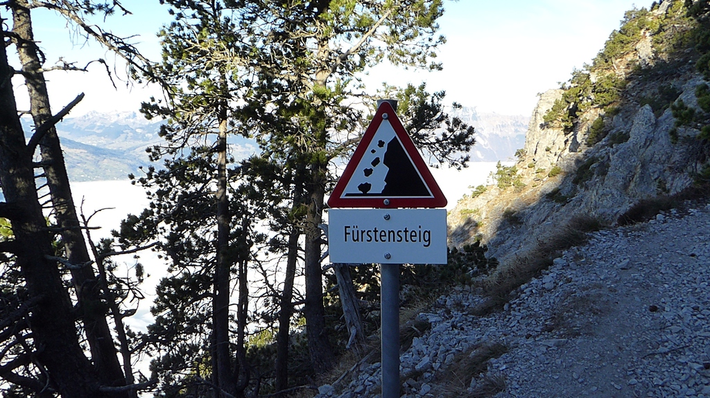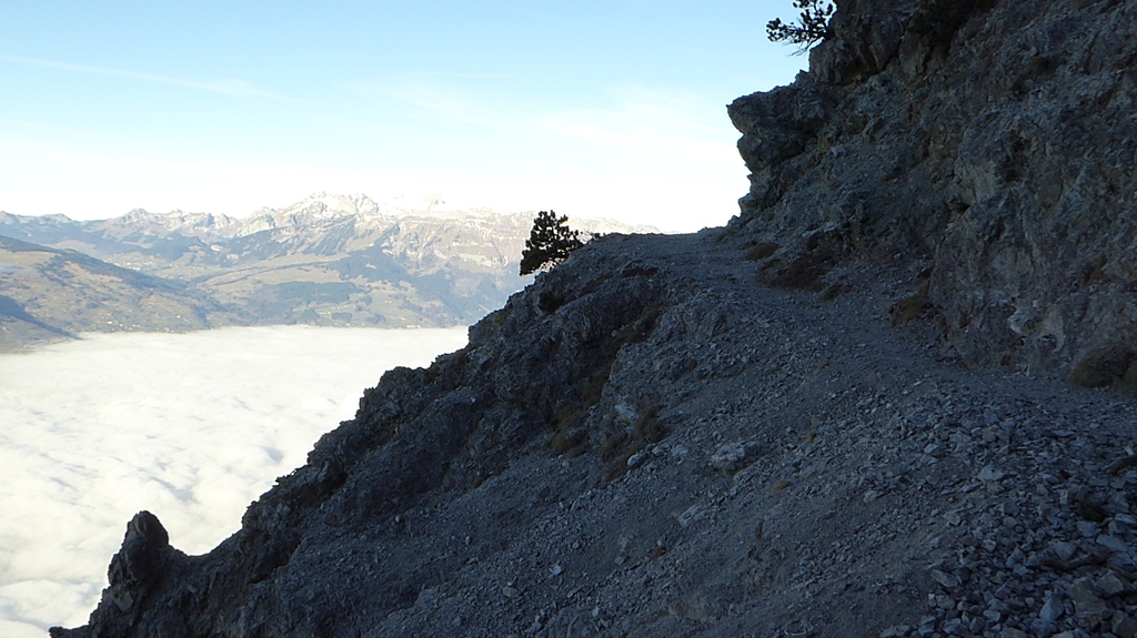 Wir wandern nur kurz aufwärts durch den Wald bis der beeindruckende Fürstensteig beginnt. Der alpine Wanderweg durchkreuzt die Nordwestwand des Alpspitz. Der in die Felswand geschlagene schmale Pfad (T3) wurde bereits 1898 eröffnet und erfordert Trittsicherheit und Schwindelfreiheit. Auch Steinschlag ist ein Thema, vor allem wenn Gämse über dir Steine lostreten. Während der Durchquerung bieten sich immer wieder herrliche Ausblicke auf die gegenüberliegende Bergwelt und das im Nebel liegende Rheintal bis zum Bodensee. Der Fürstensteig endet nach 1,6 km sowie 350 Höhenmetern und einigen Kehren am Gafleisattel (1.853 m).