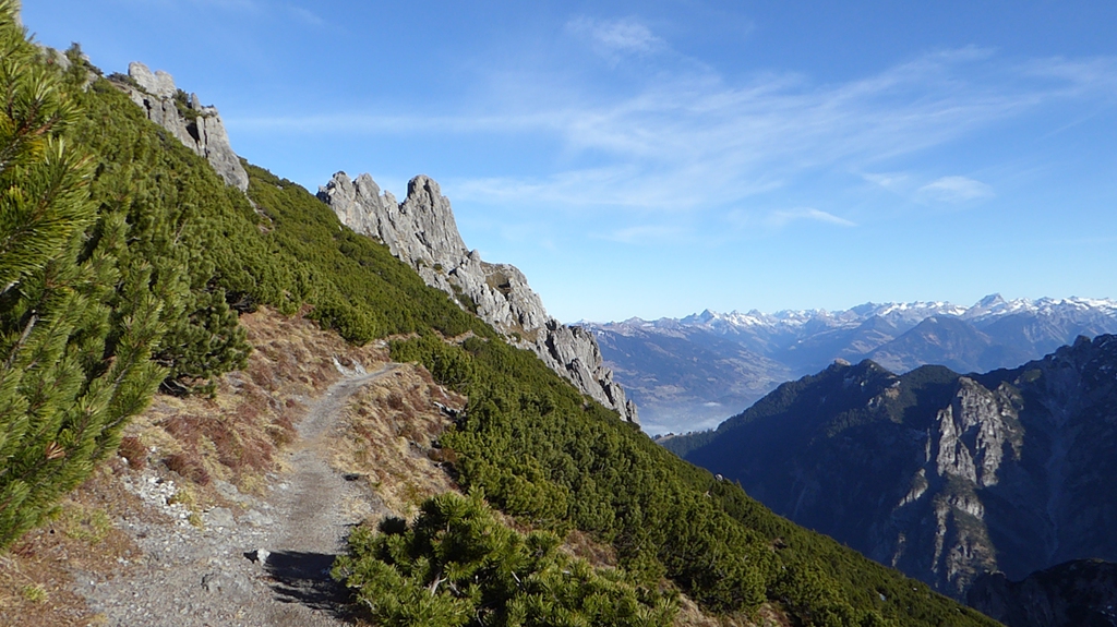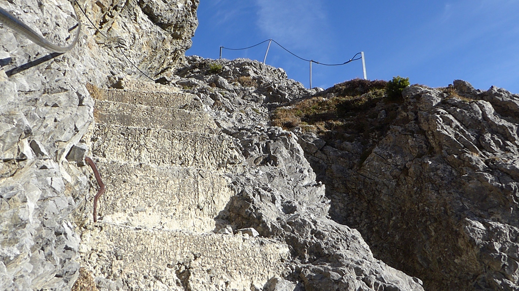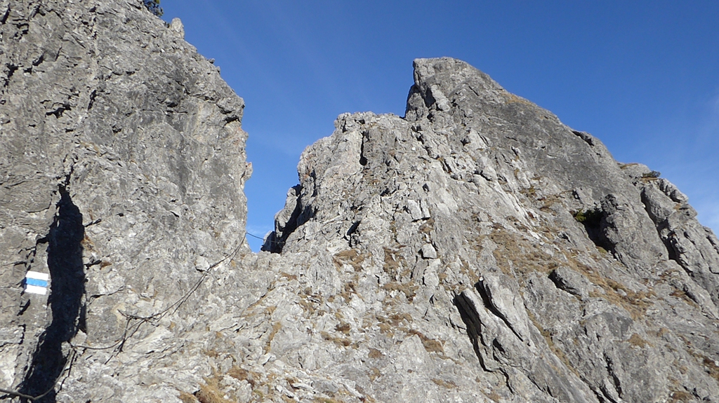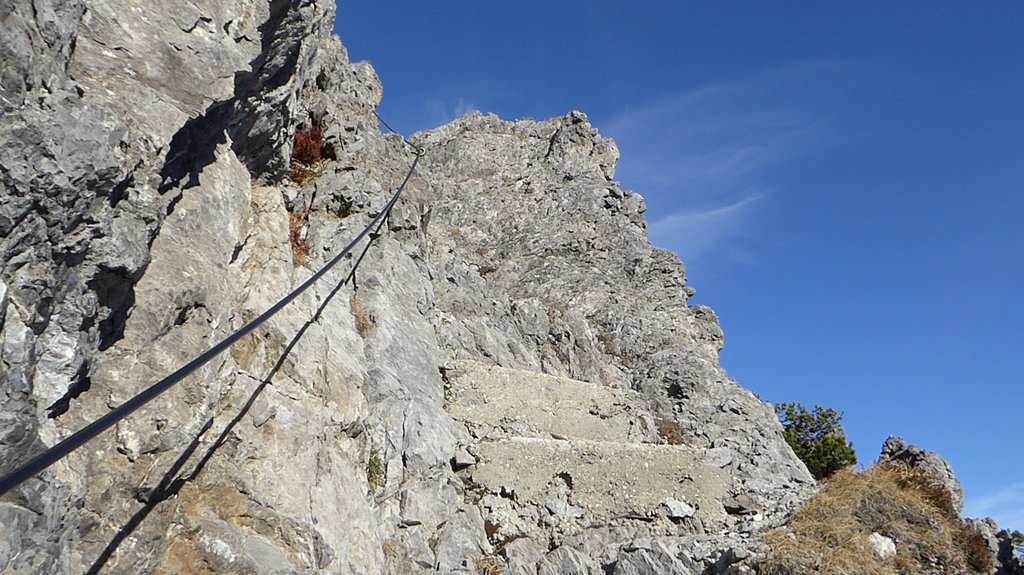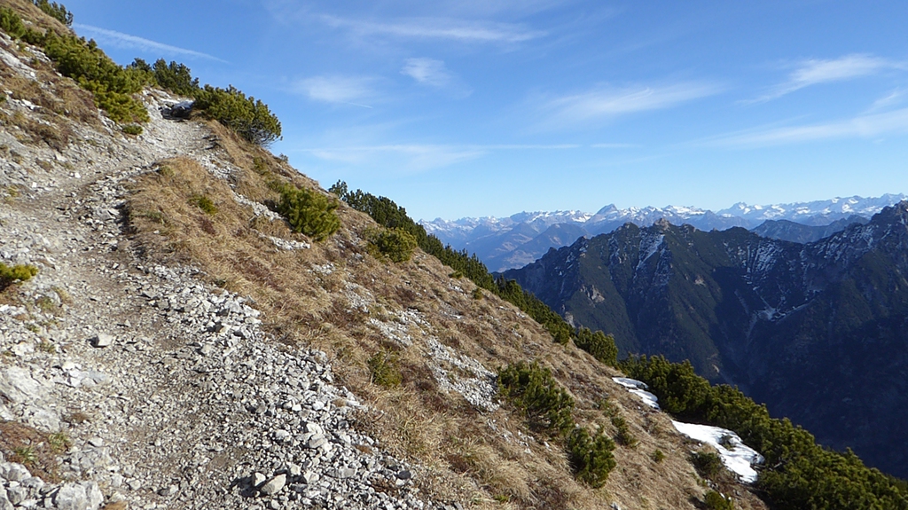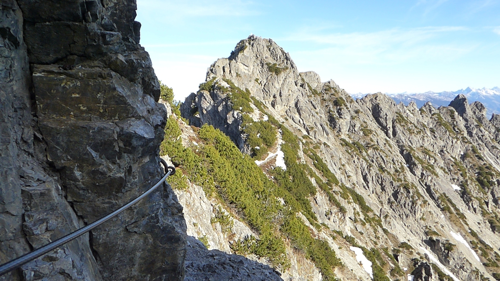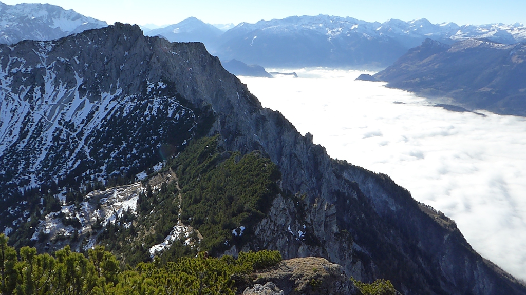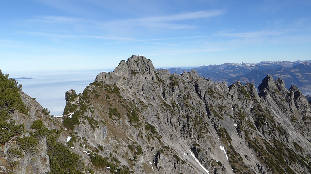 Die Aussicht vom Kuegrat ist ebenfalls beeindruckend. Wir gehen weiter auf der Ostseite weiter zum nächsten Gipfel. Diese Seite ist steil und liegt im Schatten, so dass der Abstieg bei Schnee vorsichtig zu bewältigen ist. Unten angelangt geht es kurz geradeaus, bevor es erneut steil hinauf zum Garsellakopf (2.105 m) geht. Über hohe (betonierte) Stufen erfolgte der sehr steile Felsaufstieg. Oben angekommen betteln einige Dohlen um Futter und Krümel und die Drei Schwestern sind mit 30 Min. angegeben.