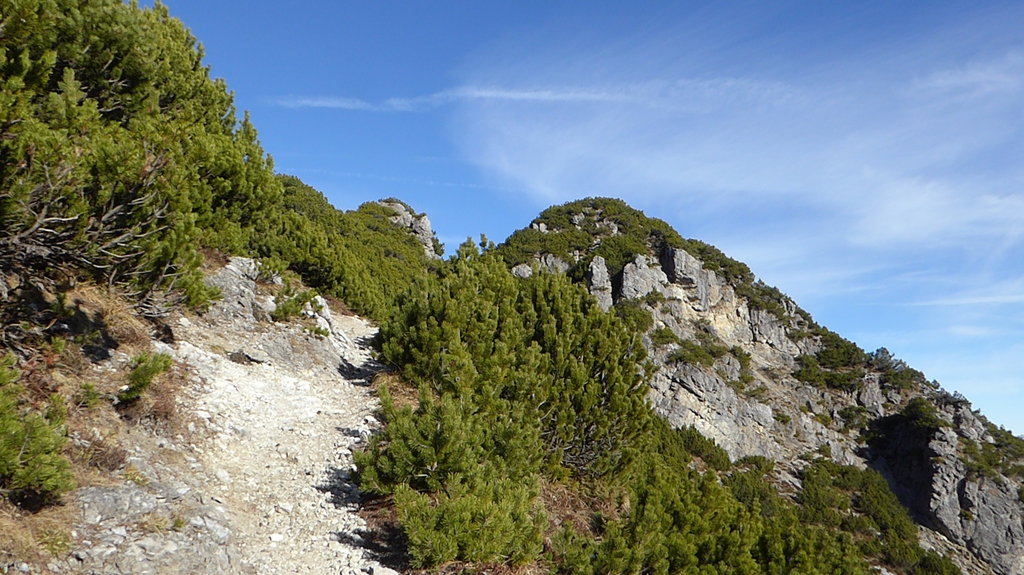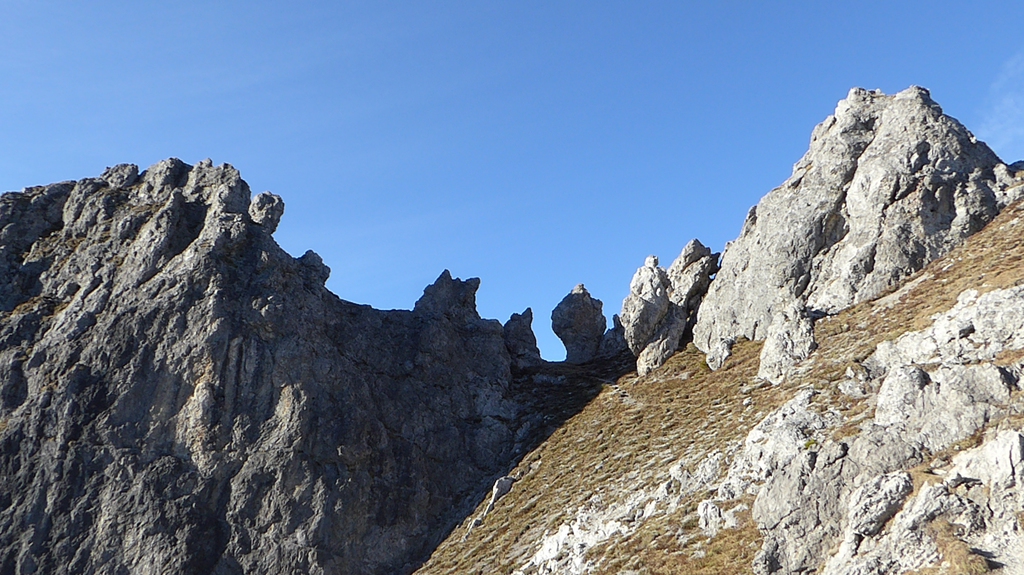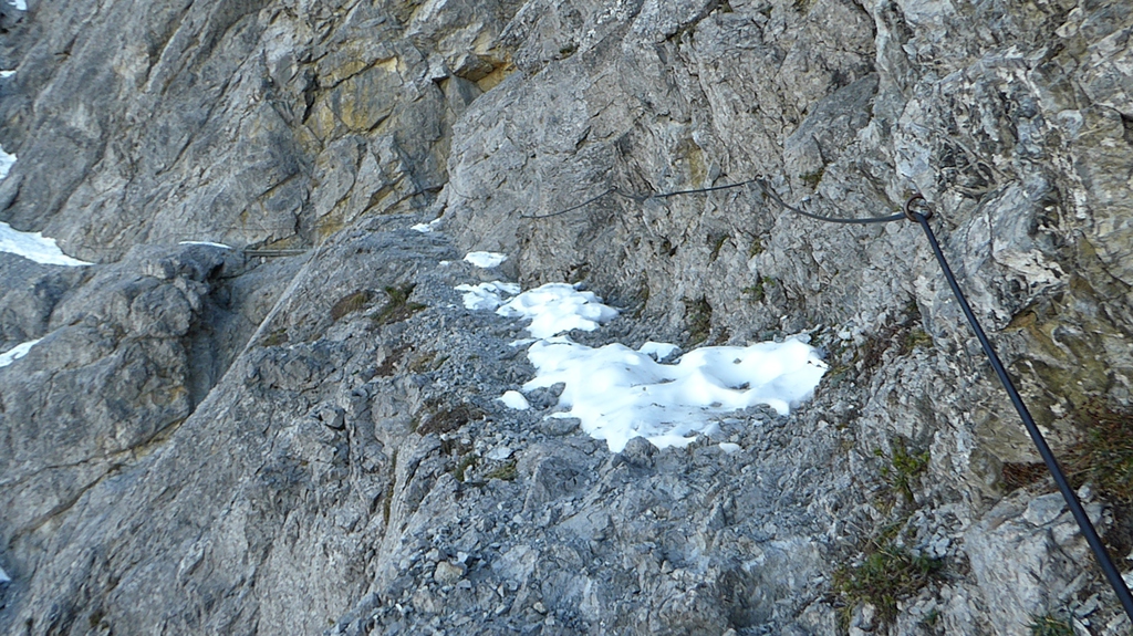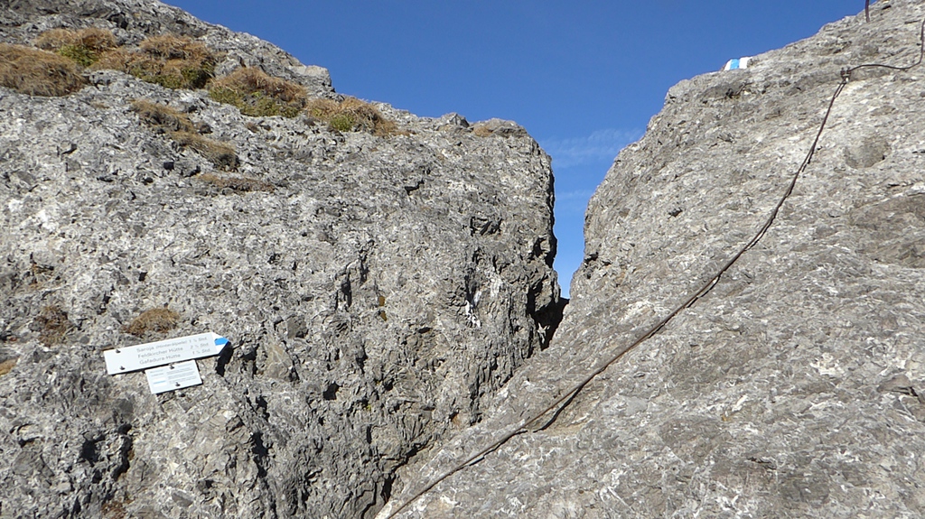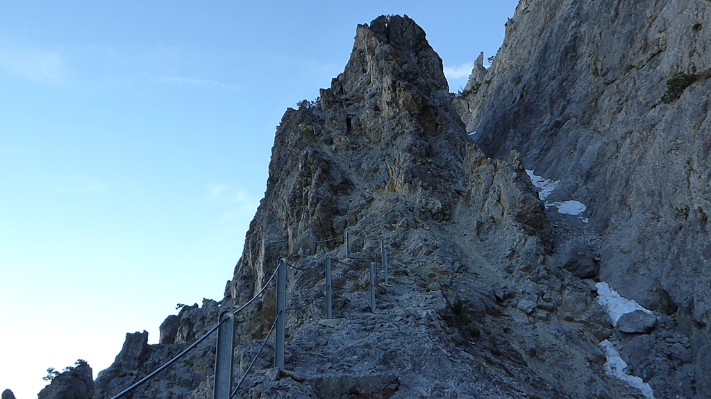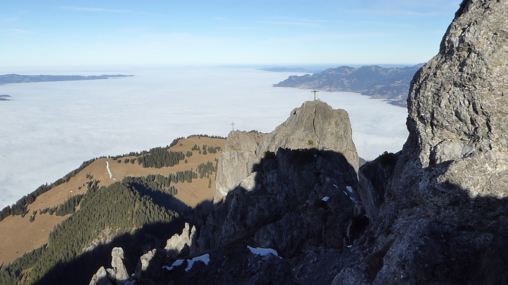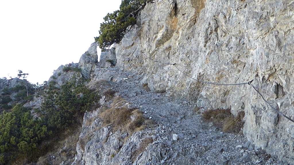 Die Aussicht vom Kuegrat ist ebenfalls beeindruckend. Wir gehen weiter auf der Ostseite weiter zum nächsten Gipfel. Diese Seite ist steil und liegt im Schatten, so dass der Abstieg bei Schnee vorsichtig zu bewältigen ist. Unten angelangt geht es kurz geradeaus, bevor es erneut steil hinauf zum Garsellakopf (2.105 m) geht. Über hohe (betonierte) Stufen erfolgte der sehr steile Felsaufstieg. Oben angekommen betteln einige Dohlen um Futter und Krümel und die Drei Schwestern sind mit 30 Min. angegeben.