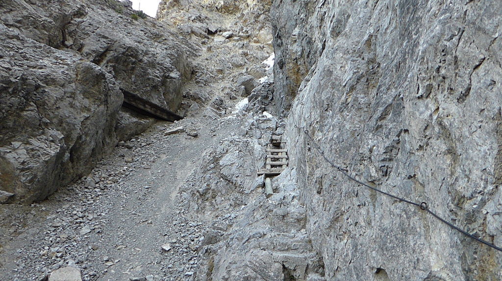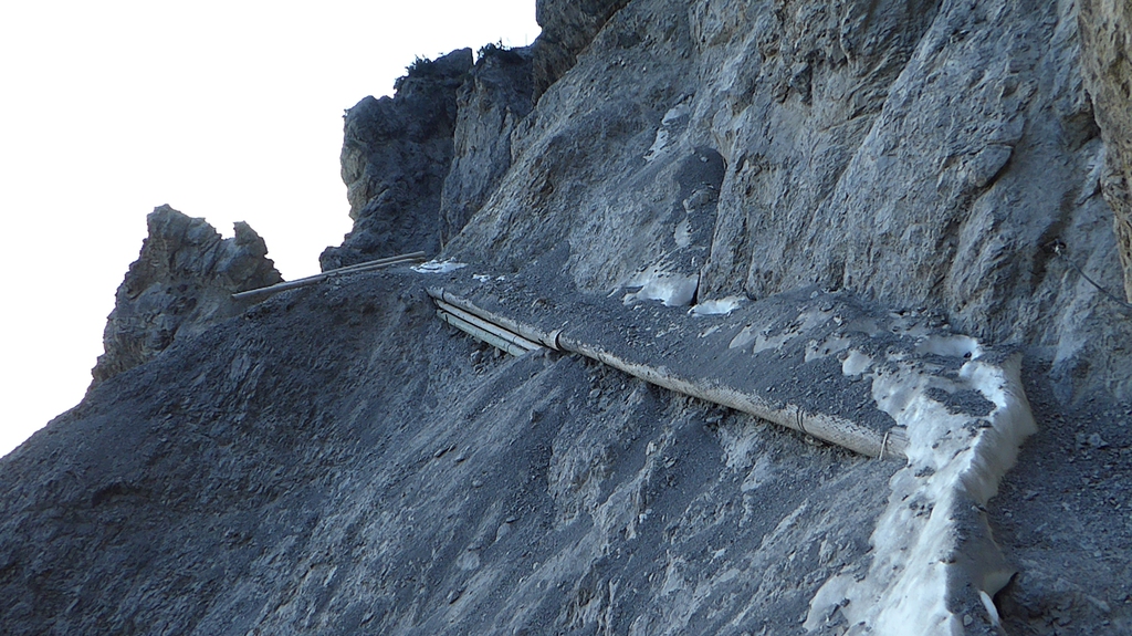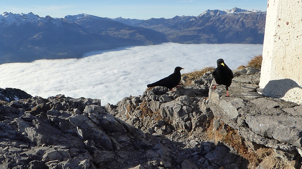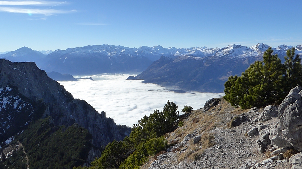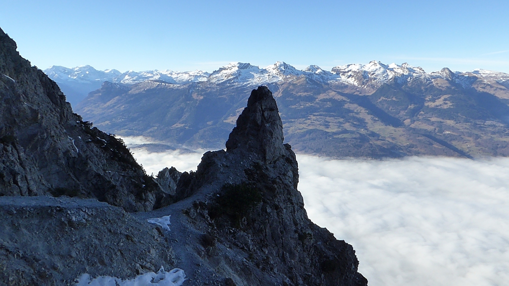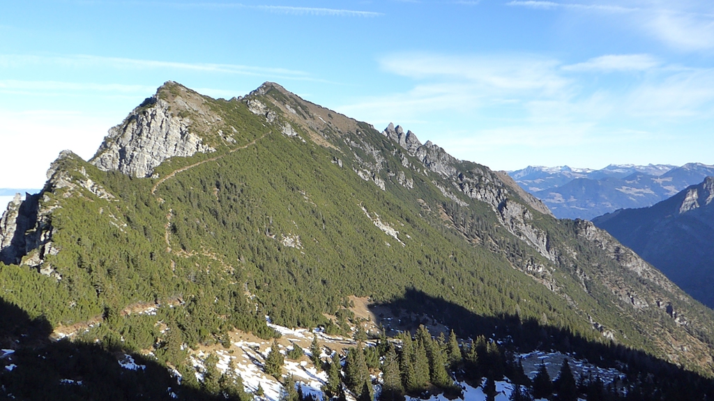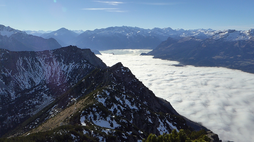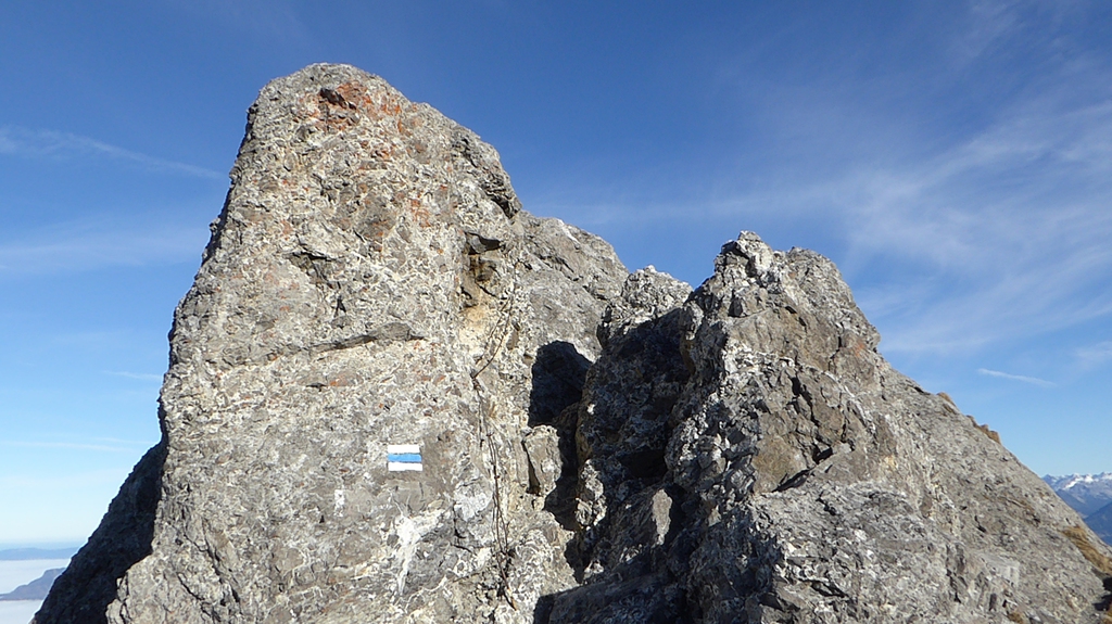 Die Aussicht vom Kuegrat ist ebenfalls beeindruckend. Wir gehen weiter auf der Ostseite weiter zum nächsten Gipfel. Diese Seite ist steil und liegt im Schatten, so dass der Abstieg bei Schnee vorsichtig zu bewältigen ist. Unten angelangt geht es kurz geradeaus, bevor es erneut steil hinauf zum Garsellakopf (2.105 m) geht. Über hohe (betonierte) Stufen erfolgte der sehr steile Felsaufstieg. Oben angekommen betteln einige Dohlen um Futter und Krümel und die Drei Schwestern sind mit 30 Min. angegeben.