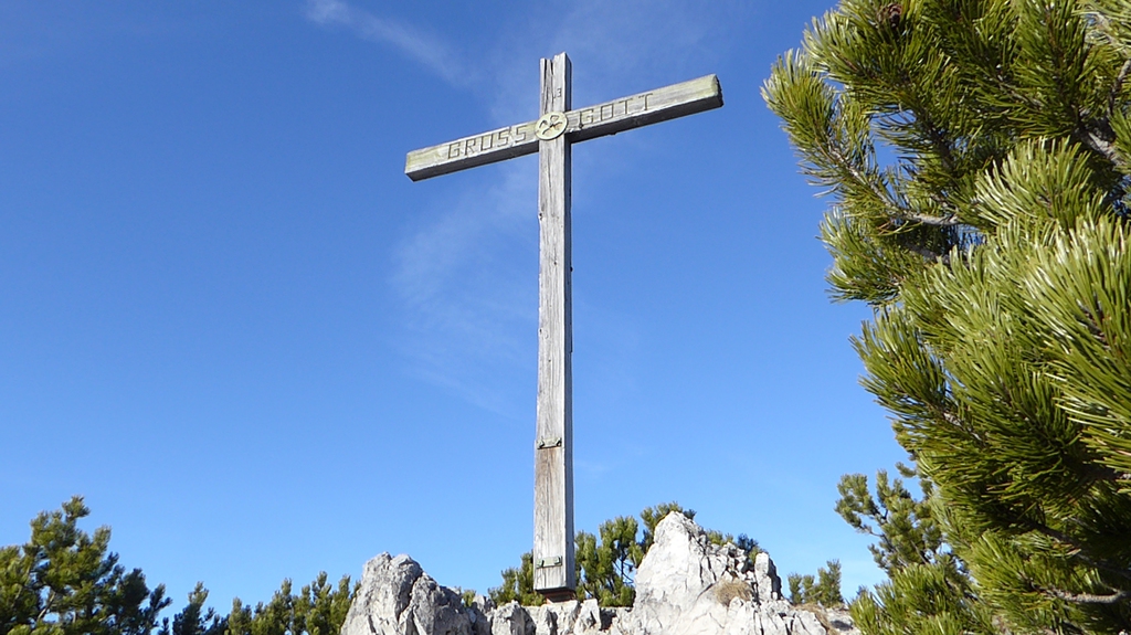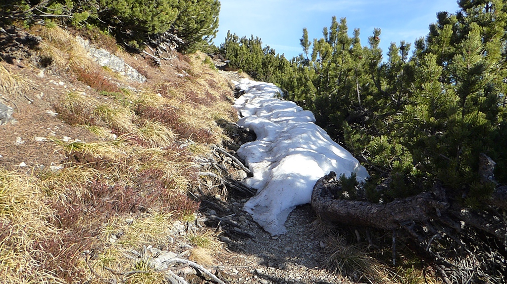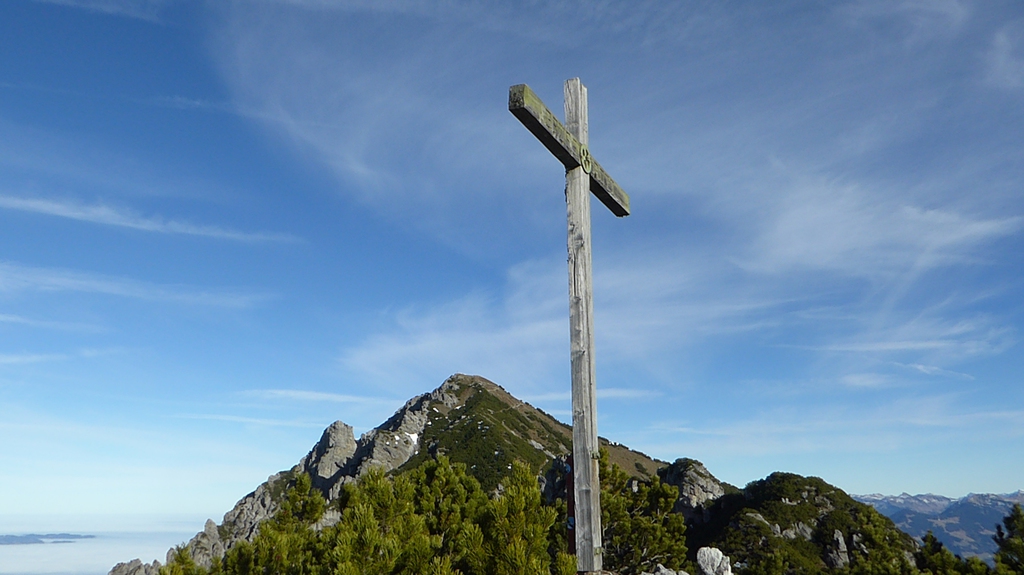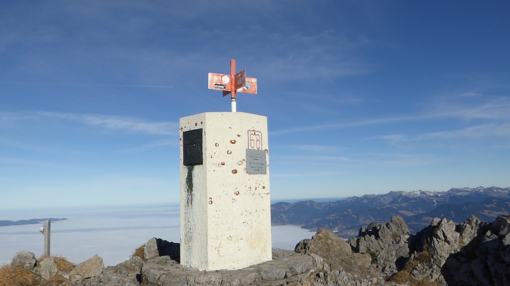 Auf der schattigen Ostseite ist der Schnee ebenfalls liegengeblieben und der steile Abstieg ist daher behutsam anzugehen. Nach 30 Minuten erreichen wir schließlich unser Ziel und stehen auf der großen Schwester (2.052 m). Wir genießen wieder das tolle Panorama und wandern wieder zurück zum Parkplatz nach Gaflei (analog Hinweg), den wir nach insgesamt 6,5 Stunden wieder erreichen.