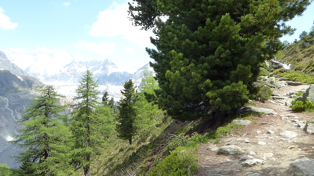 Spektakulärer Weg mit fast beständigem Blick auf den Grossen Aletschgletscher, der die Herzen höher schlagen lässt. Viel Mut braucht man auf der beeindruckenden Hängebrücke: