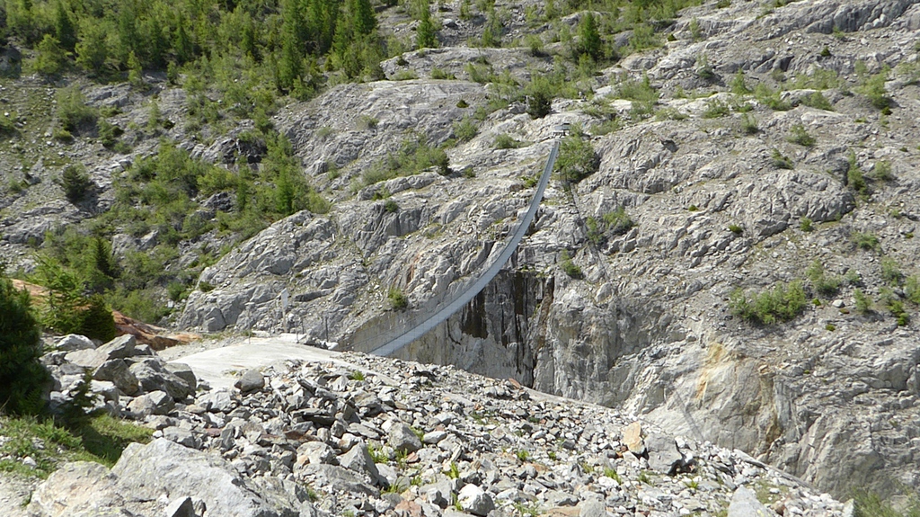 Die Hängebrücke ist 124 Meter lang und führt über die 80 Meter tiefe Massaschlucht - Nervenkitzel garantiert! Die Hängebrücke liegt vor dem Gletschertor des Grossen Aletschgletschers. Und wie es sich