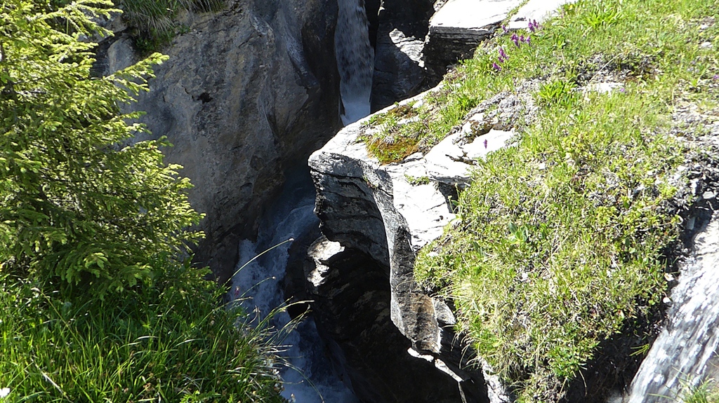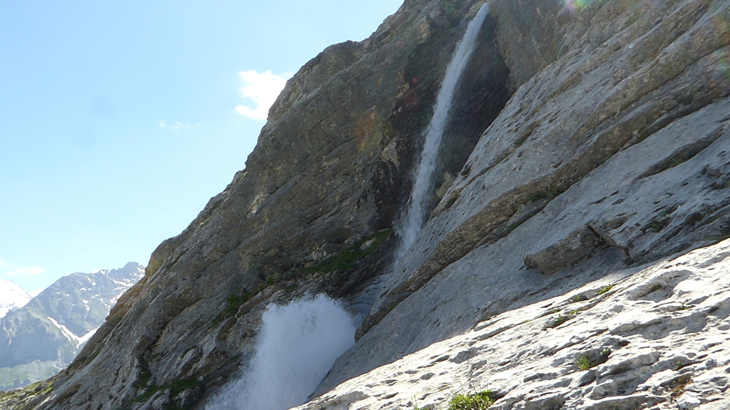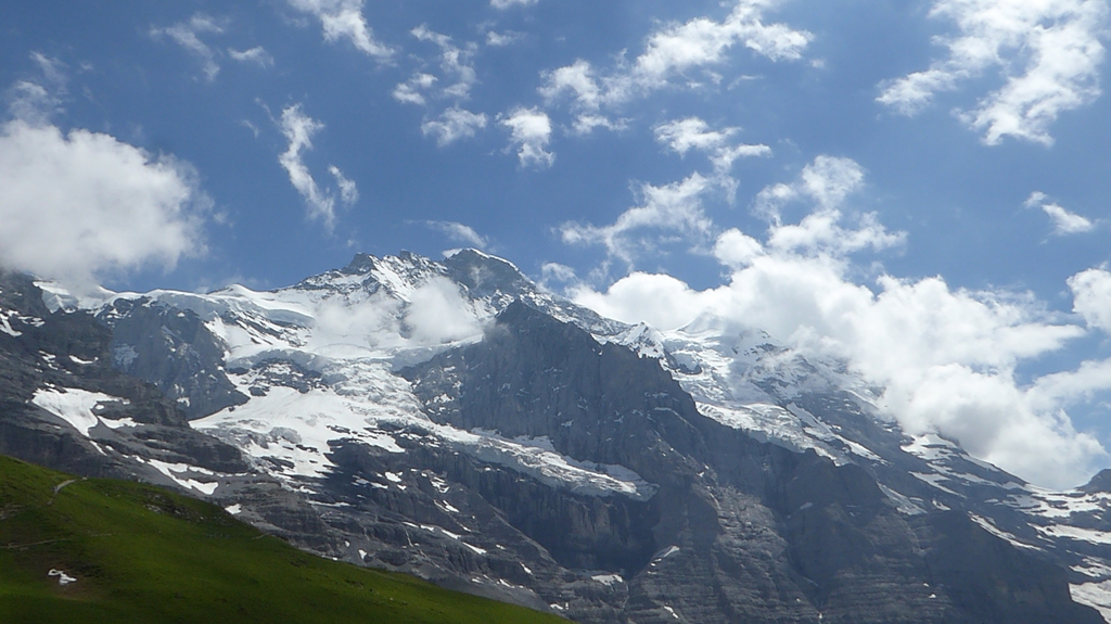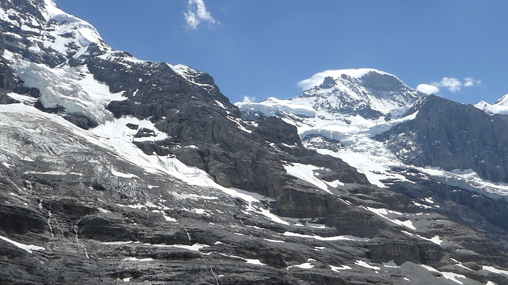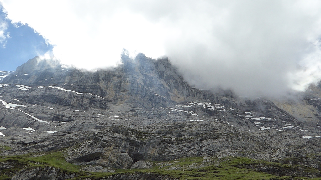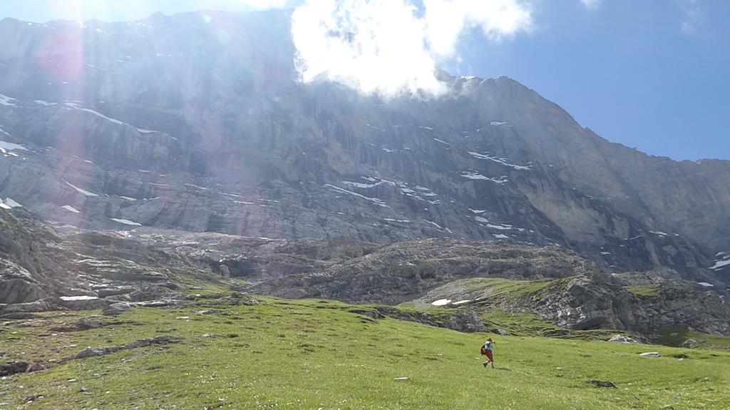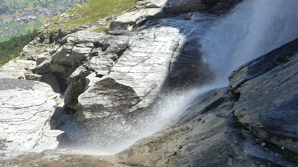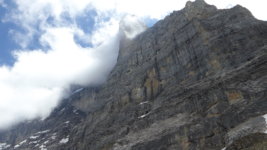 Mit Bruder Kaj starten wir heute in Grindelwald / Grund und fahren mit der Jungfraujochbahn nach Alpiglen. Hier geht es in steilen Serpentinen hinauf in Richtung Nordwand. Erstes Highlight der Tour ist ein Wasserfall. Der Weg führt direkt daran vorbei, so dass man ganz nah heranlaufen kann. Je näher wir dem Berg kommen und die mächtige Größe der Wand klar wird, fragen wir uns immer wieder, wie Bergsteiger da überhaupt raufkommen.