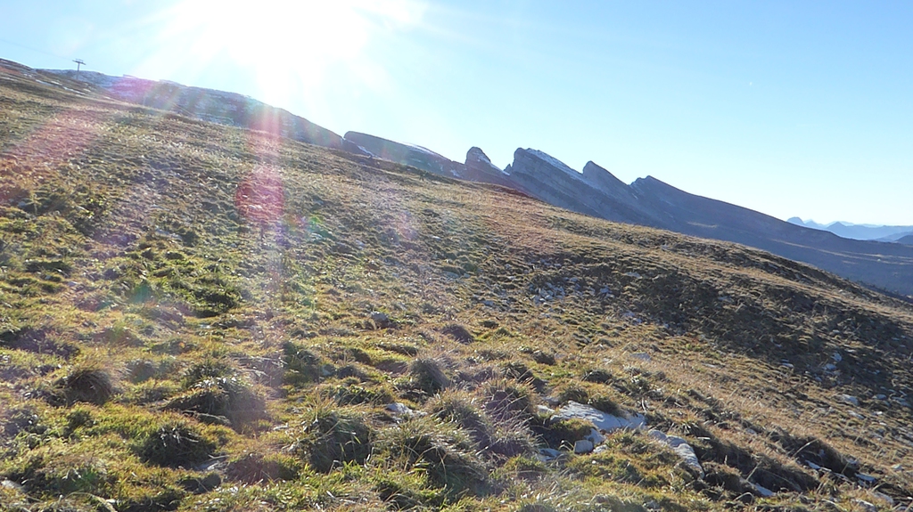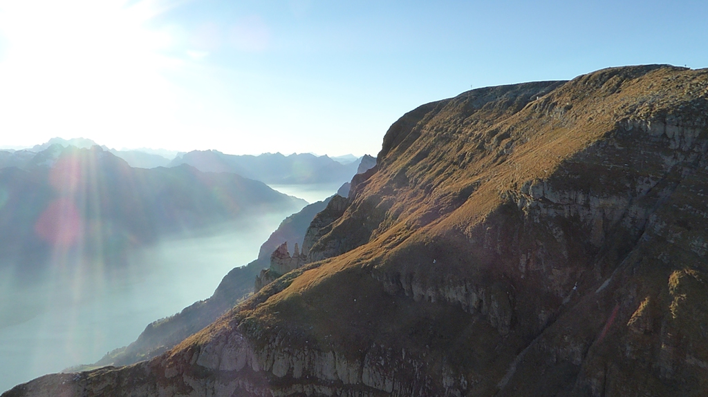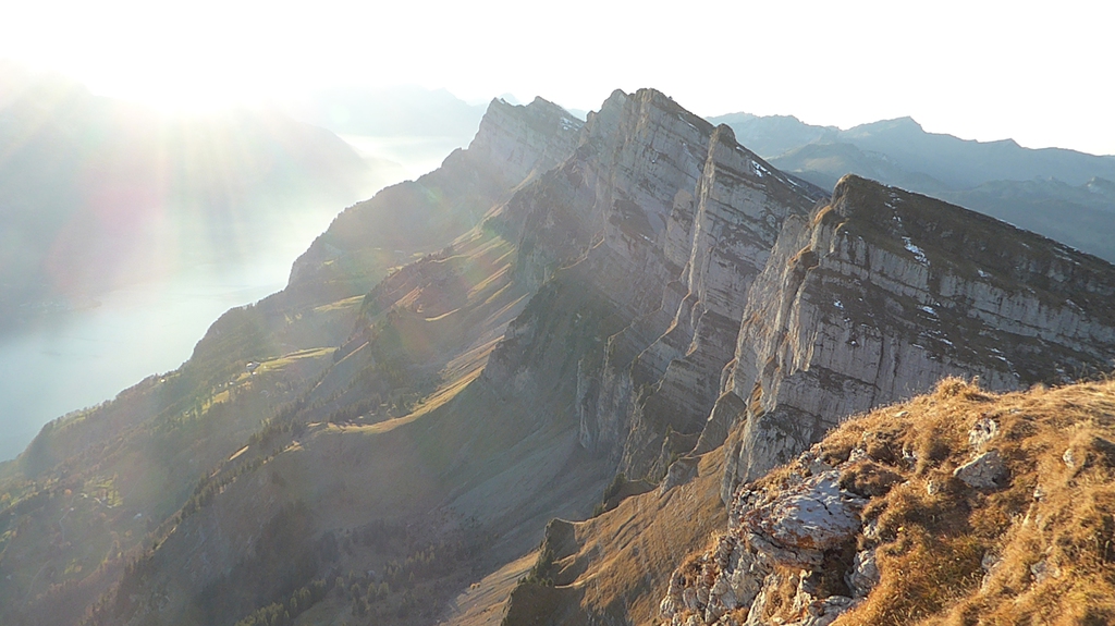 Weiter ging es vom Chäserrugg zum Hinterrrugg (2.306 m). Hier verweilten wir etwas länger, genossen die Sonne und die tolle Sicht zum Walensee und den Churfirsten. Die Fernsicht war beeindruckend: Sie reichte vom Arlberggebiet bis Richtung Gotthard. Der Hinterrugg ist der mit über 2.300 m der höchste Berg der Churfirsten. Kurz vor dem Sonnenuntergang nahmen wir die Seilbahn nach Unterwasser (Toggenburg).
