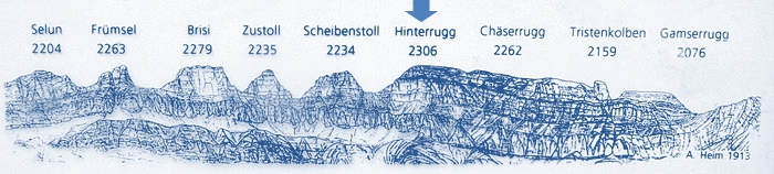 Die "sieben Churfirsten", heissen von Westen nach Osten: Selun (2205 m), Frümsel (2263 m), Brisi (2279 m), Zuestoll (2235 m), Schibenstoll (2234 m), Hinterrugg (2306 m) und Chäserrugg (2262 m):