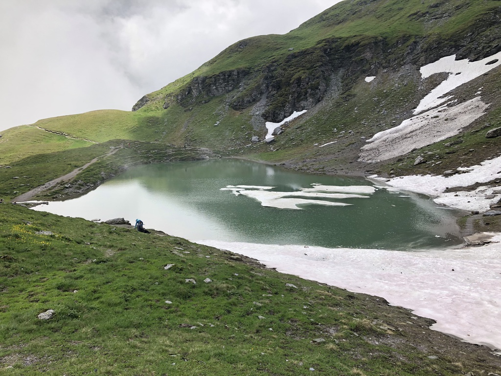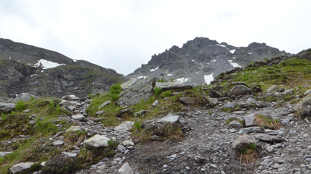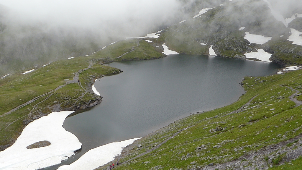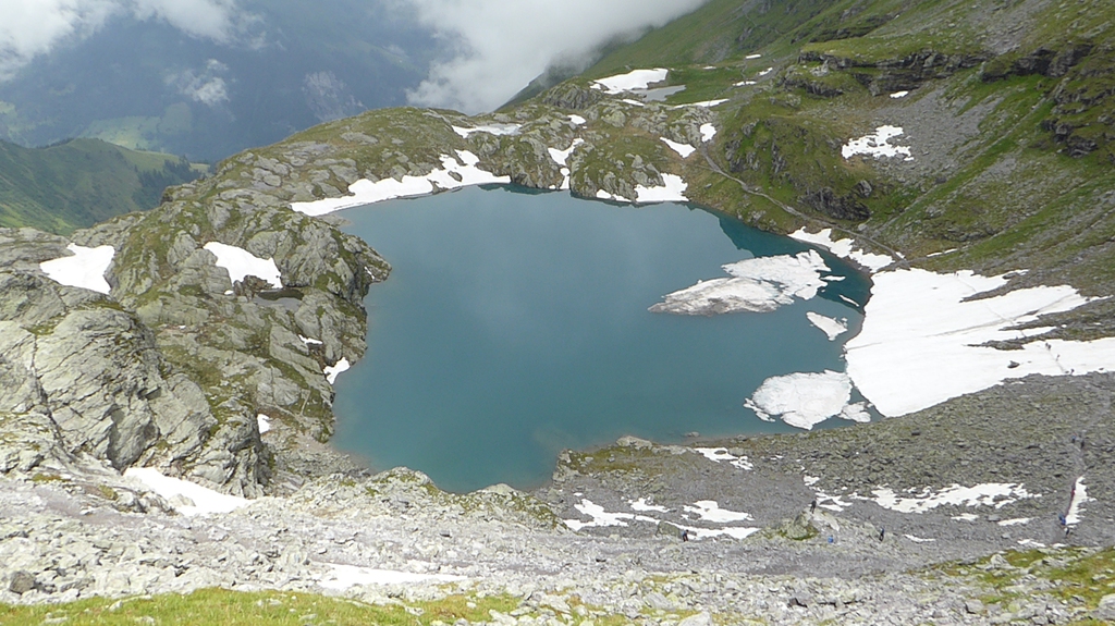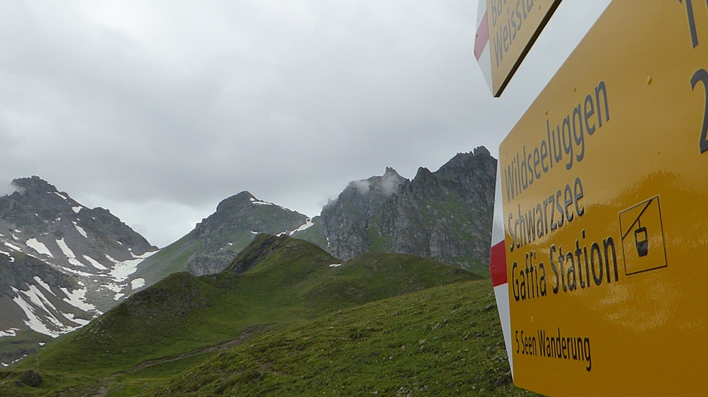 Zum Schwarzsee erfolgt zuerst wieder ein steiler Anstieg, der in Serpentinen bewältigt wird. Und nachdem der Bergrücken oben erreicht ist, geht es auch gleich wieder steil nach unten, so dass der Schwarzsee mit 2.372m insgesamt nicht viel höher ist. als der Schottensee. Mit etwas Glück können am Schwarzsee Steinböcke, Gemsen und Adler beobachtet werden. Doch statt dieser Tiere gibt es heute abwechselnd dichte Wolken und Sonnenstrahlen mit freier Sicht. Ab und zu hört man aber ein Murmeltier pfeifen. Der nächste See ist der Baschalvasee, der mit 1 Stunde angegeben ist.