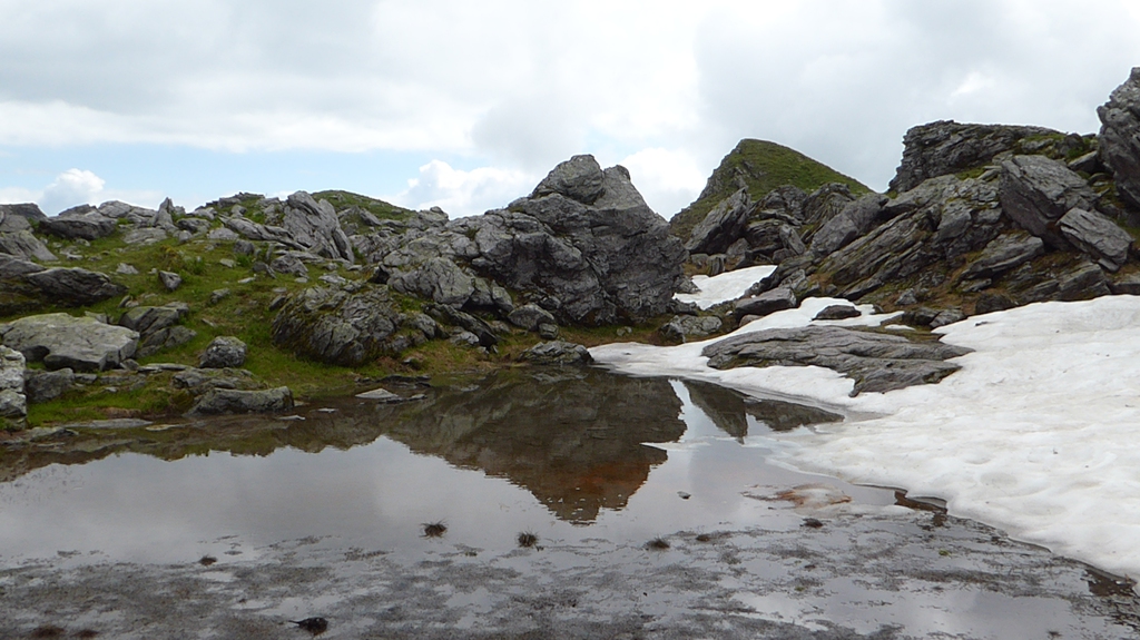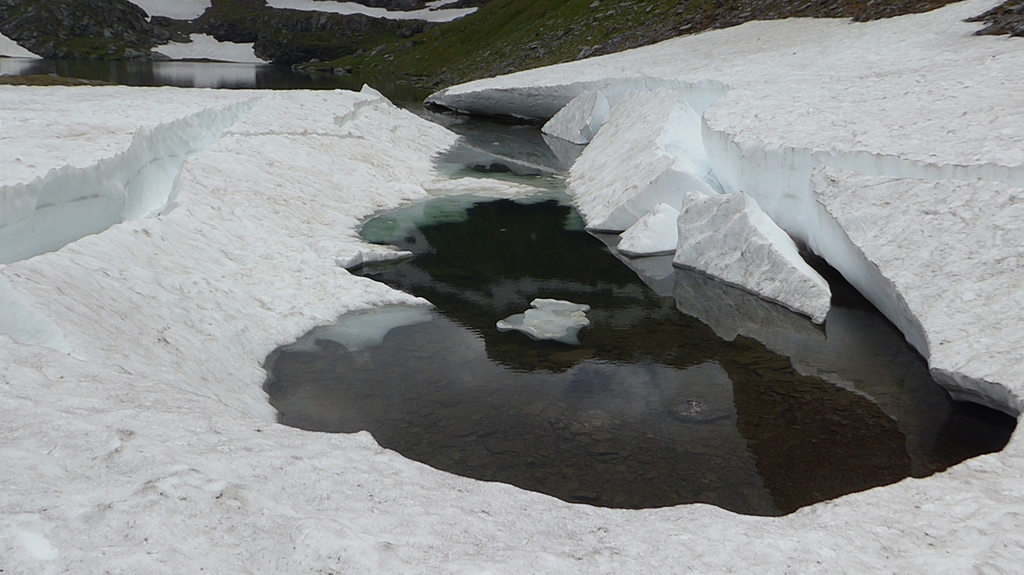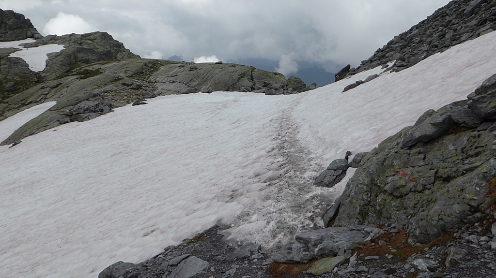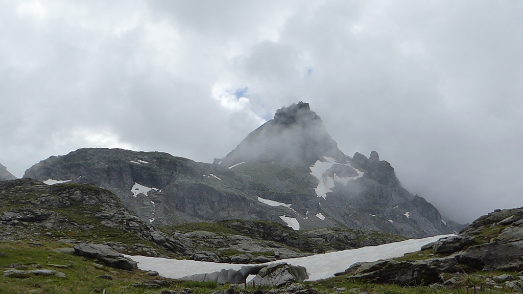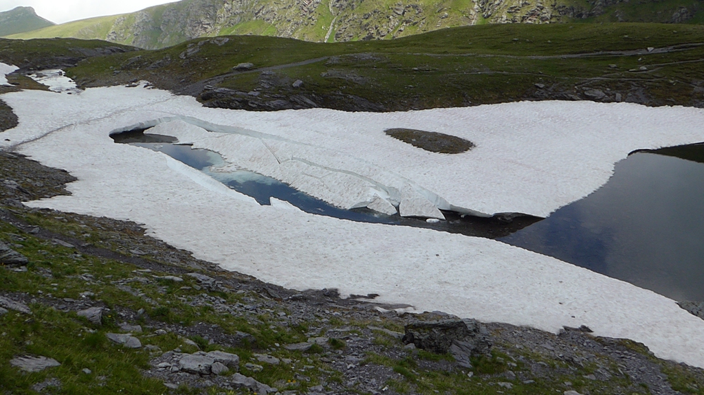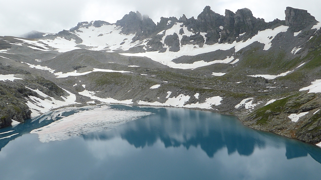 Zum Schwarzsee erfolgt zuerst wieder ein steiler Anstieg, der in Serpentinen bewältigt wird. Und nachdem der Bergrücken oben erreicht ist, geht es auch gleich wieder steil nach unten, so dass der Schwarzsee mit 2.372m insgesamt nicht viel höher ist. als der Schottensee. Mit etwas Glück können am Schwarzsee Steinböcke, Gemsen und Adler beobachtet werden. Doch statt dieser Tiere gibt es heute abwechselnd dichte Wolken und Sonnenstrahlen mit freier Sicht. Ab und zu hört man aber ein Murmeltier pfeifen. Der nächste See ist der Baschalvasee, der mit 1 Stunde angegeben ist.