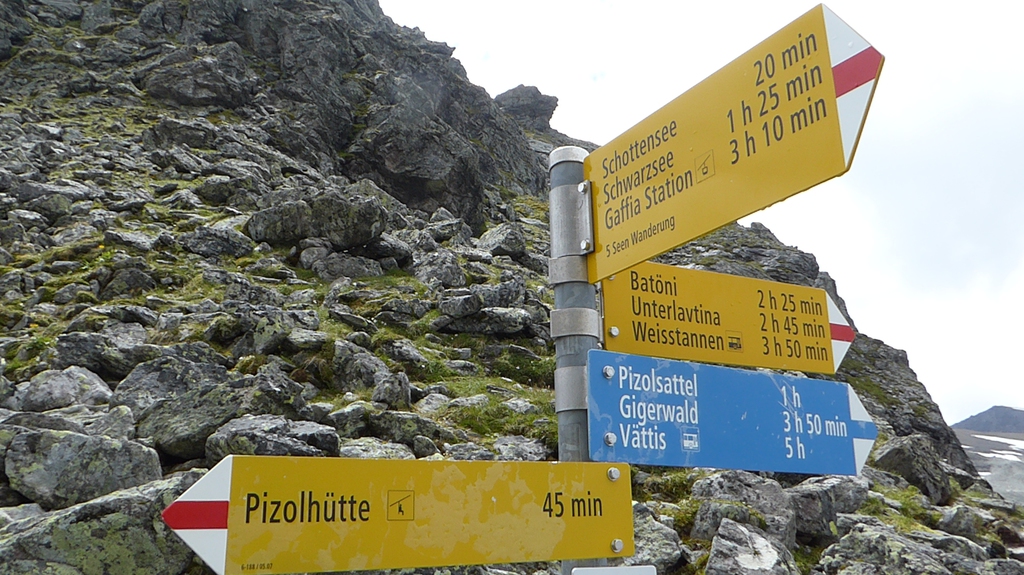 Dies war der 5. und letzte See und die Gaffia-Sesselliftstation ist mit 50 Minuten angegeben. Wer es gegen Ende eilig hat und die letzte Bergbahn erreichen möchte, kann Gas geben, denn es geht nun nur noch abwärts. Schwarzsee, Basegglagrat und Baschalvasee sind übrigens drei von über 50 «Orten des Staunens» in der Ferienregion Heidiland. Diese speziellen Plätze wurden von der Forschungsstelle Kraftorte Schweiz auf ihren energetischen Gehalt und ihren mythologischen Hintergrund hin untersucht und dokumentiert. So lässt sich die Strecke zwischen Schwarzsee und Gaffia alternativ auch als «Route des Staunens» erwandern.