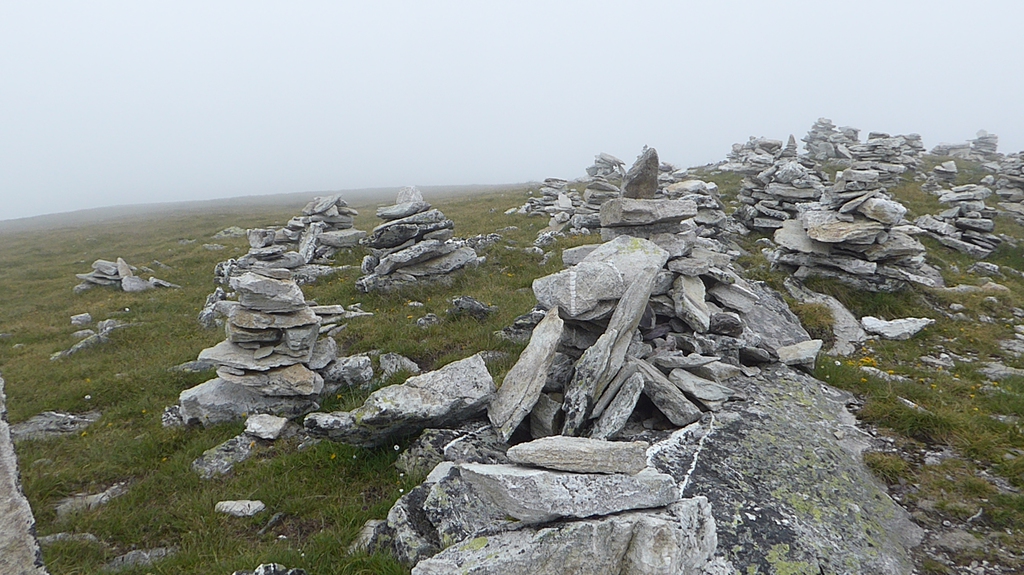 Nach einem kurzen Anstieg erreichen wir das Plateau auf dem Basegglagrat. Die grosse Ansammlung von Steinmännchen entbehrt nicht eines gewissen Mysteriums. So sollen die ältesten der unterschiedlich grossen Steintürme aus prähistorischer Zeit stammen und der Rundhügel auf Baseggla ein Kult- und Opferplatz gewesen sein. Nun geht es abwärts Richtung Baschalvasee (2.172m), den wir nach knapp einer Stunde durch die die Felsen unten sehen. Neben türkisen und schwarzen Seen, leuchtet der Baschalvasee in einem herrlich grün.
