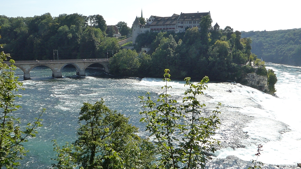 Auf ausgebauten Wegen erreicht man auf beiden Rheinseiten Aussichtsplattformen. Diese ragen teilweise weit über den Rhein hinaus. Am Rheinfallbecken in Neuhausen am Rheinfall liegt das Schlösschen Wörth. Von hier aus kann man mit Ausflugsbooten dicht an den Rheinfall heranfahren und sich auch am mittleren Felsen absetzen lassen. Die Besteigung der Aussichtsplattform mit naher Sicht auf den Fall erfolgt über schmale und steile Treppen. Ausserdem werden kleine und grosse Rheinfallrundfahrten sowie die Übersetzung zum Schloss Laufen angeboten.