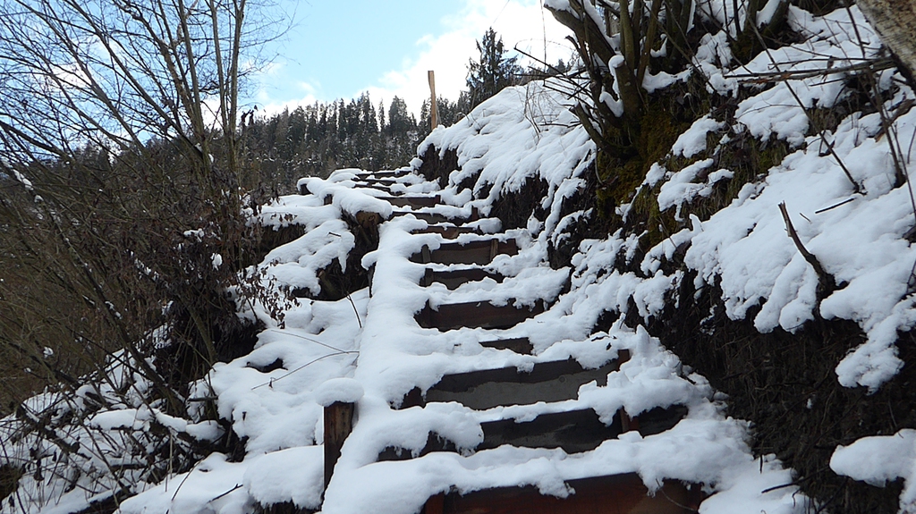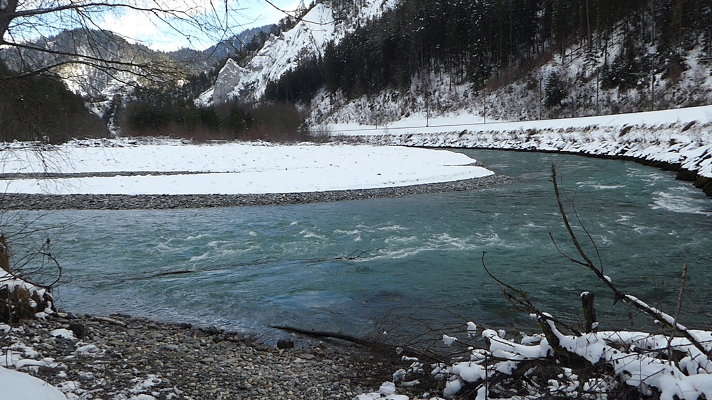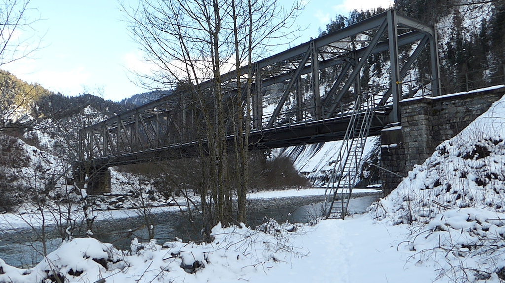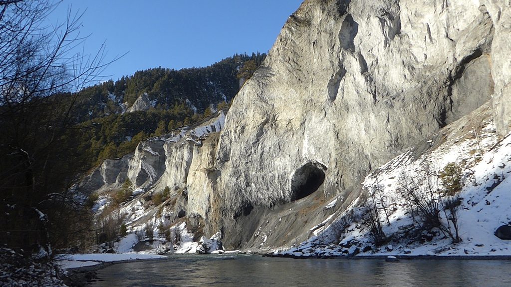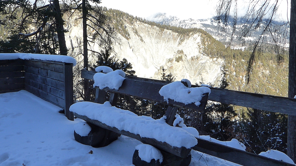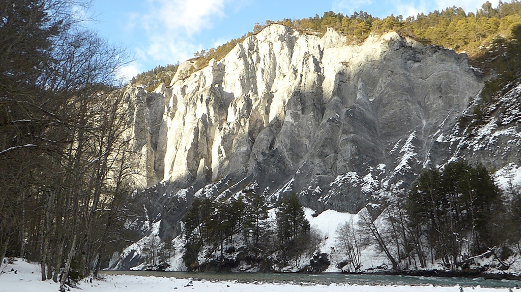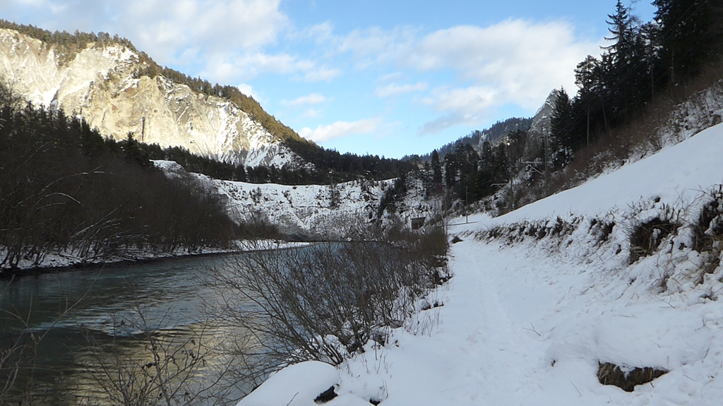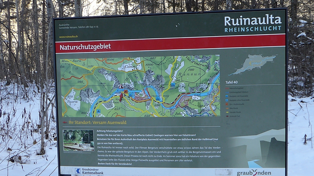 Wir starten am Bahnhof Versam/Safien (kostenpflichtige Parkplätze vorhanden) am Vorderrhein direkt unten in der Schlucht. Die faszinierenden Steilwände der Ruinaulta und das Versamer Tobel lassen sich hier aus nächster Nähe betrachten. Wir wandern durch den Schnee bis zur Halbinsel Chrummwag, auf der sich ein Rastplatz mit Feuerstelle befindet. Der Rhein macht hier eine Schlaufe und verläuft in einem Bogen um die Halbinsel. Wir wandern weiter und überqueren den Rhein über eine Eisenbahnbrücke, die wir mit dem Zug teilen. Anschließend geht es hinauf zum Ransun, wo sich ebenfalls eine Feuerstelle befindet.