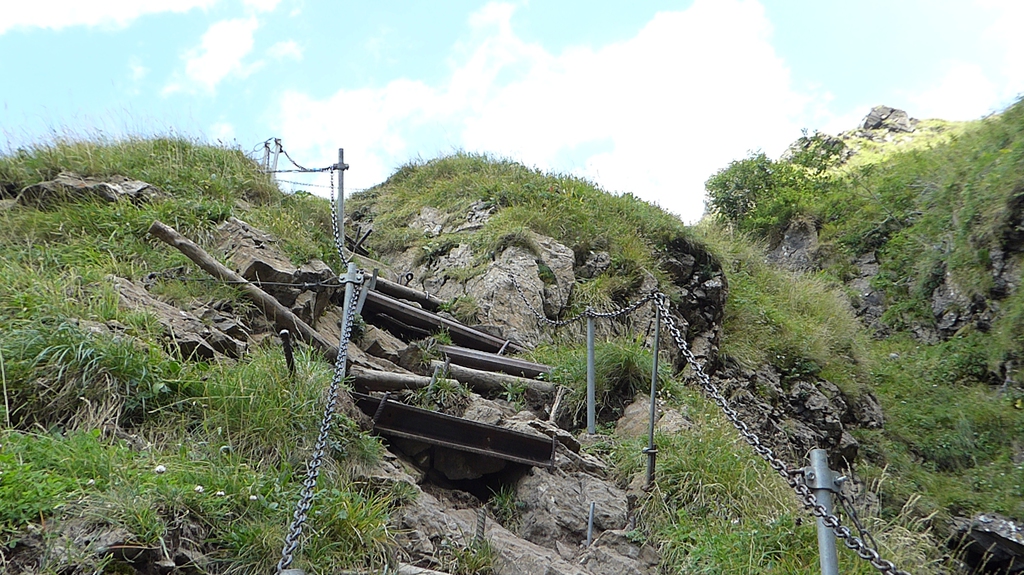 Allerdings sind alpine Bergsteigerkünste nicht erforderlich. Dank einer guten Drahtseilsicherung ist die Musfalle sehr gut zu erreichen. Im Anschluss führt der Weg weiter über ein breites Gras- und Geröllband, dann wandert man eine Zeit entlang einer Felswand.