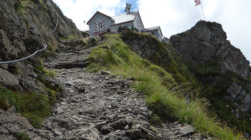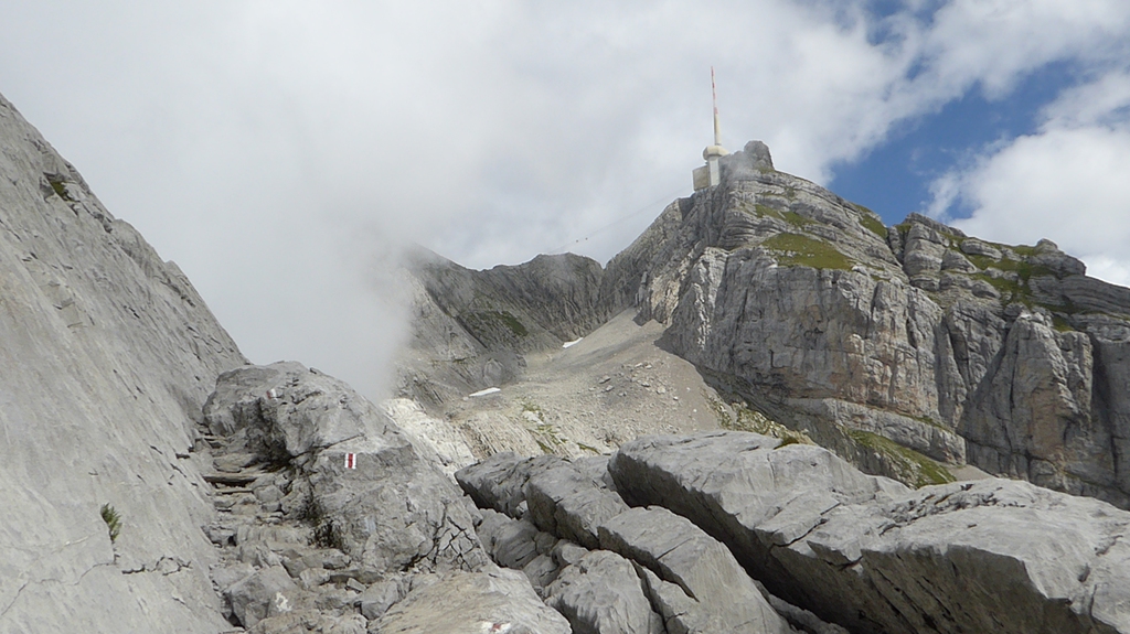Morgens geht es nach dem Frühstück dann weiter in Richtung Gipfel. Zum großen Karrenfeld aufsteigen, den Markierungen folgen, die zwischen Trichtern und Spalten hindurch zum Fuß des Hangs unter dem Girensattel und auf den Grat selbst führen. Man passiert die Blauschneelücke und hält sich rechts. Über den Himmelsleiterli genannten Klettersteig, eine Felsentreppe, zum Mehrzweckgebäude auf dem Säntisgipfel. Von hier kann man mit der Säntisbahn wieder ins Tal auf die Schwägalp hinabschweben.