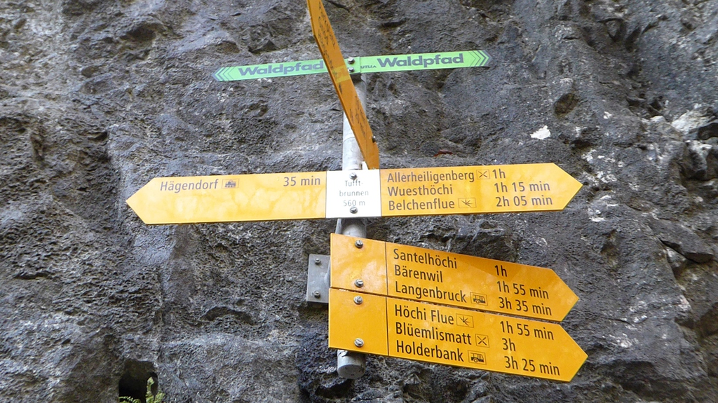 Durch kurze Felstunnels und an einem märchenhafter Moosfelsen vorbei gelangen wir zur Verzweigung Tuftbrunnen. Der nahe Picknickplatz mit Holz zum Feuern, Tisch und Bänken lockt zur Pause. Wir wandern weiter bachaufwärts Richtung "Allerheiligenberg". Beim Allerheiligenrank streifen wir die Fahrstrasse, folgen aber weiter dem Uferweg bachaufwärts. Plötzlicher Szenenwechsel, wo wir aus dem Wald treten. Dem sonnigen Waldrand entlang und durch eine Weide gehts aufwärts zum Fahrsträsschen. Über uns sehen wir die Bergwirtschaft Allerheiligenberg, wohin wir über eine Abkürzung gelangen. Hier machen wir Rast, genießen den Kinderspielplatz und füttern eine süsse rote Katze mit 3 Füßen und treten den Rückweg analog dem Hinweg an. Hier sehen wir noch ein Feuer in einer Höhle - es waren aber keine Höhlenbewohner darin, sondern Neuzeitmenschen. Insgesamt benötigen wir 4 Stunden für die ca. 7 km (440 Höhenmeter).