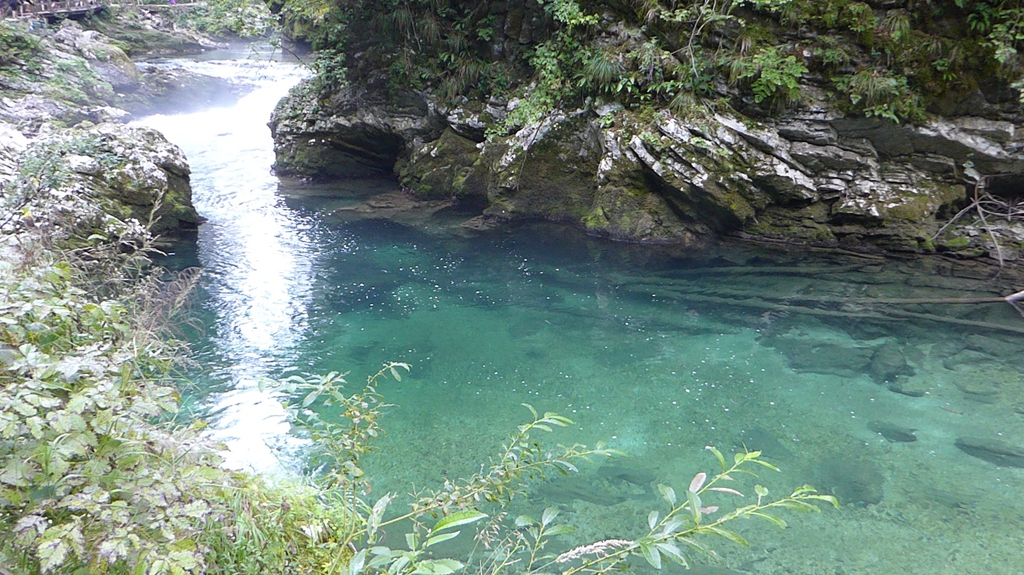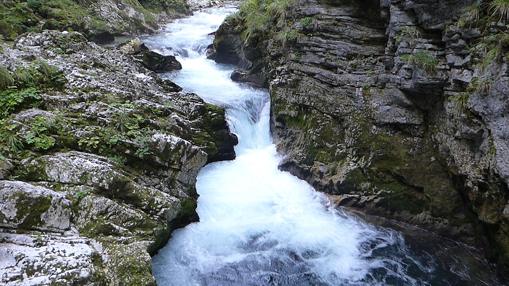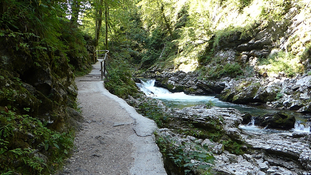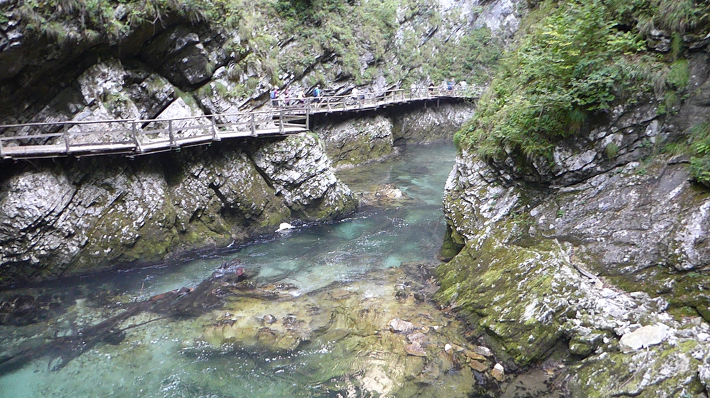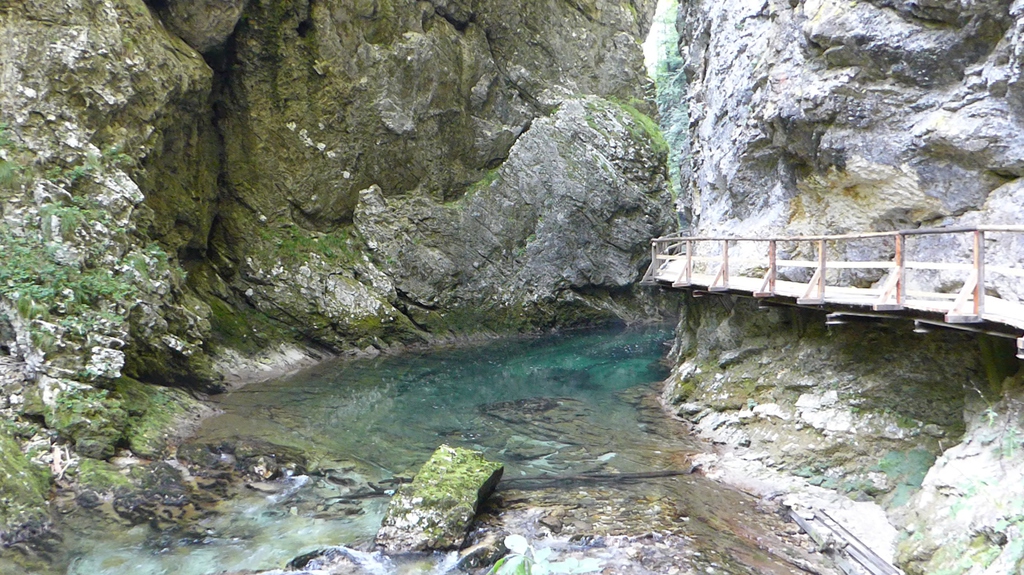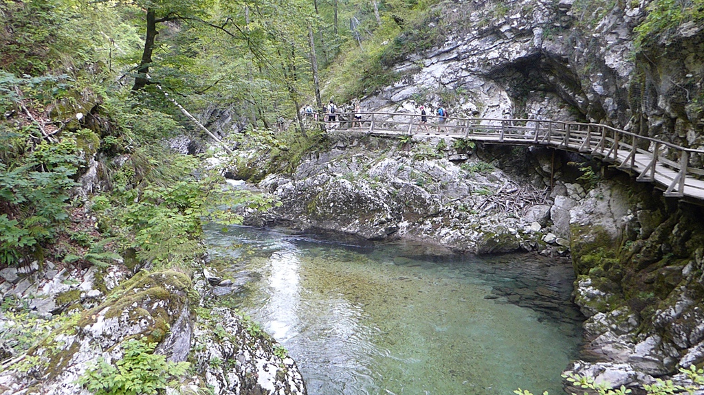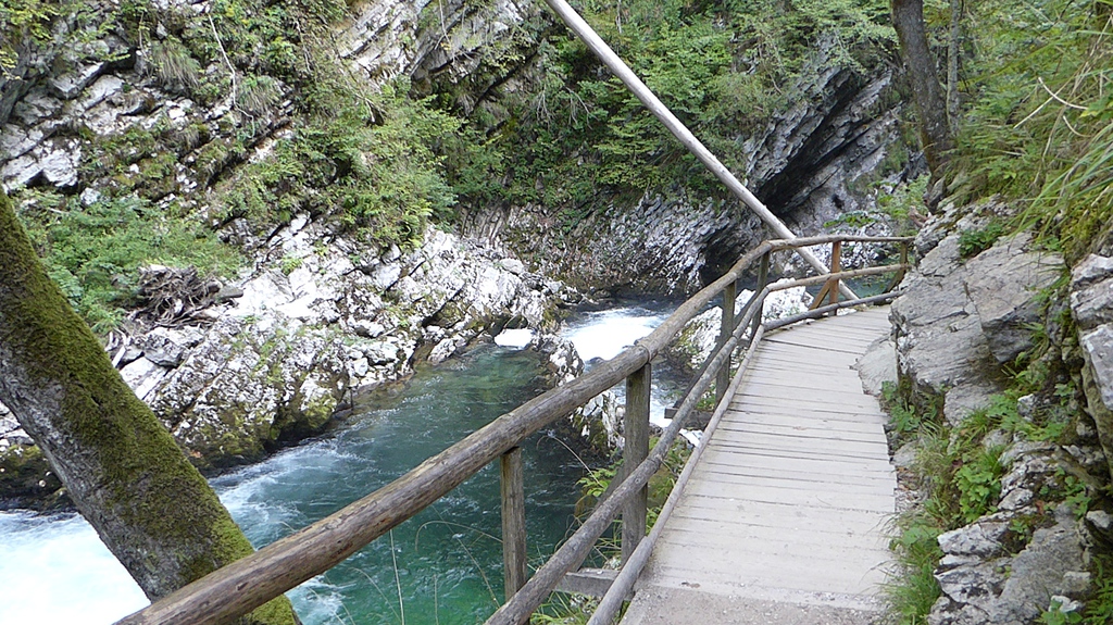 Der grünblau schimmernde Fluss Radovna, der in die Save mündet grub sich im Laufe der Jahrtausende zwischen die beiden mächtigen Berge Hom und Borst. Besucher können sich auf eine faszinierende Wanderung entlang des 1,6 km langen Lehrpfades durch die Vintgar Klamm begeben. Um die Stege und Wege zu erhalten ist am Eingang der Schlucht ein kleiner Eintrittspreis zu entrichten.
