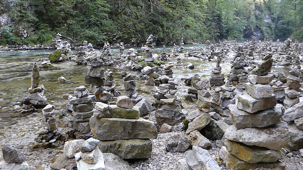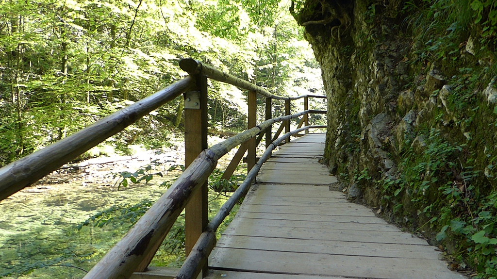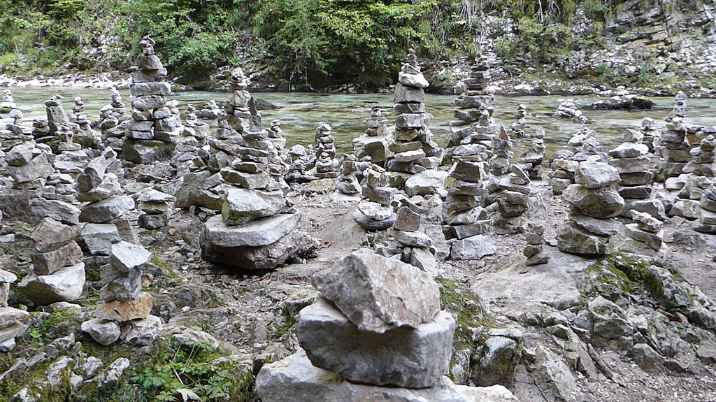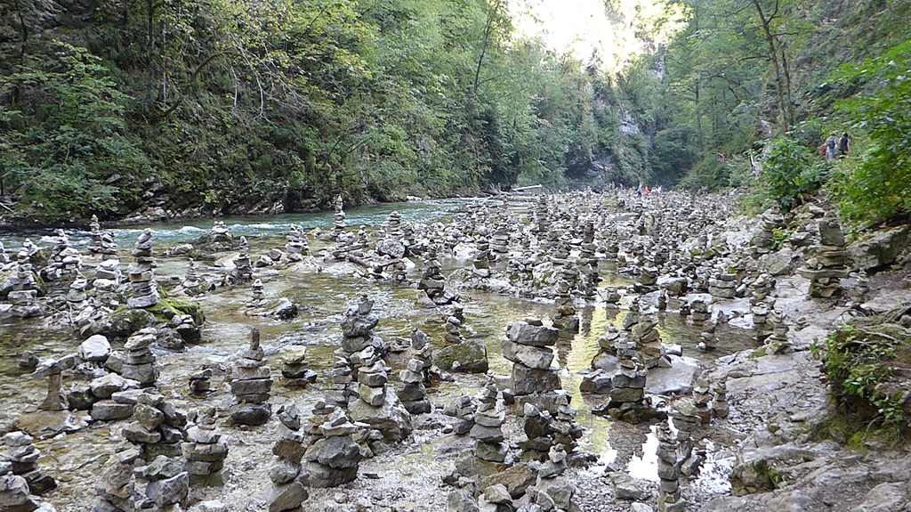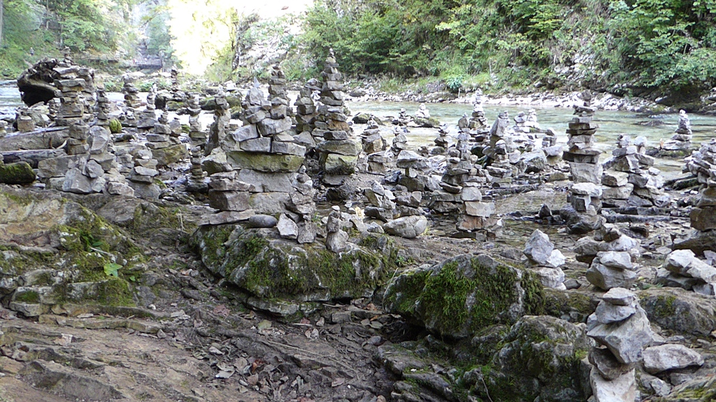 Entlang des Lehrpfades durch die Vintgar Klamm können Sie natürliche Schönheiten wie die Zumer Galerie, die impo- santen Felswände des Hom und des Borst, zahlreiche kleine Wasserfälle und natürlich den Wasserfall Sum, an dem die Radovna rauschend, etwa 13 m in die Tiefe stürzt. Von Menschenhand erbaut, aber auch sehenswert ist die große steinere Eisenbahnbrücke, die über knapp 33 m über die Schlucht verläuft. Faszinierend ist auch ein Meer aus Steinmännchen direkt am Fluss.